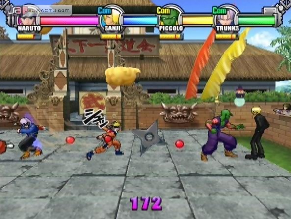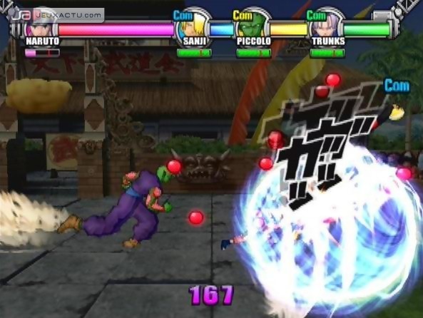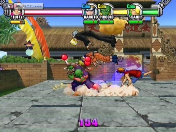 Parce qu'on ne parle que de lui en cette fin de mois de juillet 2006 au Japon, nous avons également décidé de nous procurer une version PS2 de Battle Stadium D.O.N, ce Smash Bros-like qui regroupe les meilleurs personnages de l'univers de Dragon Ball Z, One Piece et Naruto. Les trois plus grand succès de Shônen Jump dans un seul et même jeu, on n'avait pas vu ça depuis Jump Super Stars sur Nintendo DS. Mais cette fois-ci, ça se passe sur GameCube et PS2 pour une envergure plus importante puisqu'il sera possible de jouer jusqu'à 4 en même temps. Les Kaméhamé, Rasengan et autres Kage bushin no jutsu se croisent à volonté pour des batailles épiques. En attendant de tout débloquer pour un test import complet à venir, voici une grosse série d'images maison (130 en tout) pour patienter.