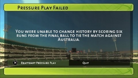 Pour nos rares fans de cricket qui suivent assidûment l’actualité vidéoludique de leur sport préféré, Codemasters nous fait parvenir ces nouvelles et ultimes images du jeu PSP Brian Lara 2007 Pressure Play. Pourquoi « ultimes », tout simplement parce que le soft vient de débarquer en Angleterre et en Australie avec son mode inédit ICC Cricket World Cup comprenant les licences des équipes nationales australienne, indienne, anglaise ou pakistanaise.