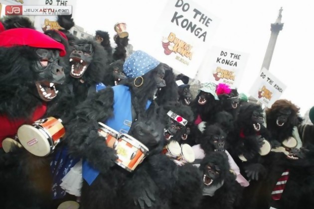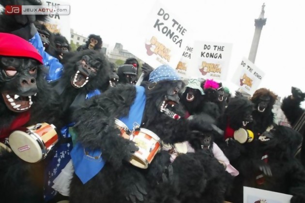 A l’occasion de la sortie de Donkey Konga (déjà testé dans nos colonnes) sur le territoire dela perfide Albion, Nintendo a lâché ses faux primates dans Trafalgar Square. On imagine aisément la tête des touristes confrontés à cette horde de gorilles armés de bongos. L’histoire ne dit pas si les londoniens en ont perdu leur légendaire flegme.