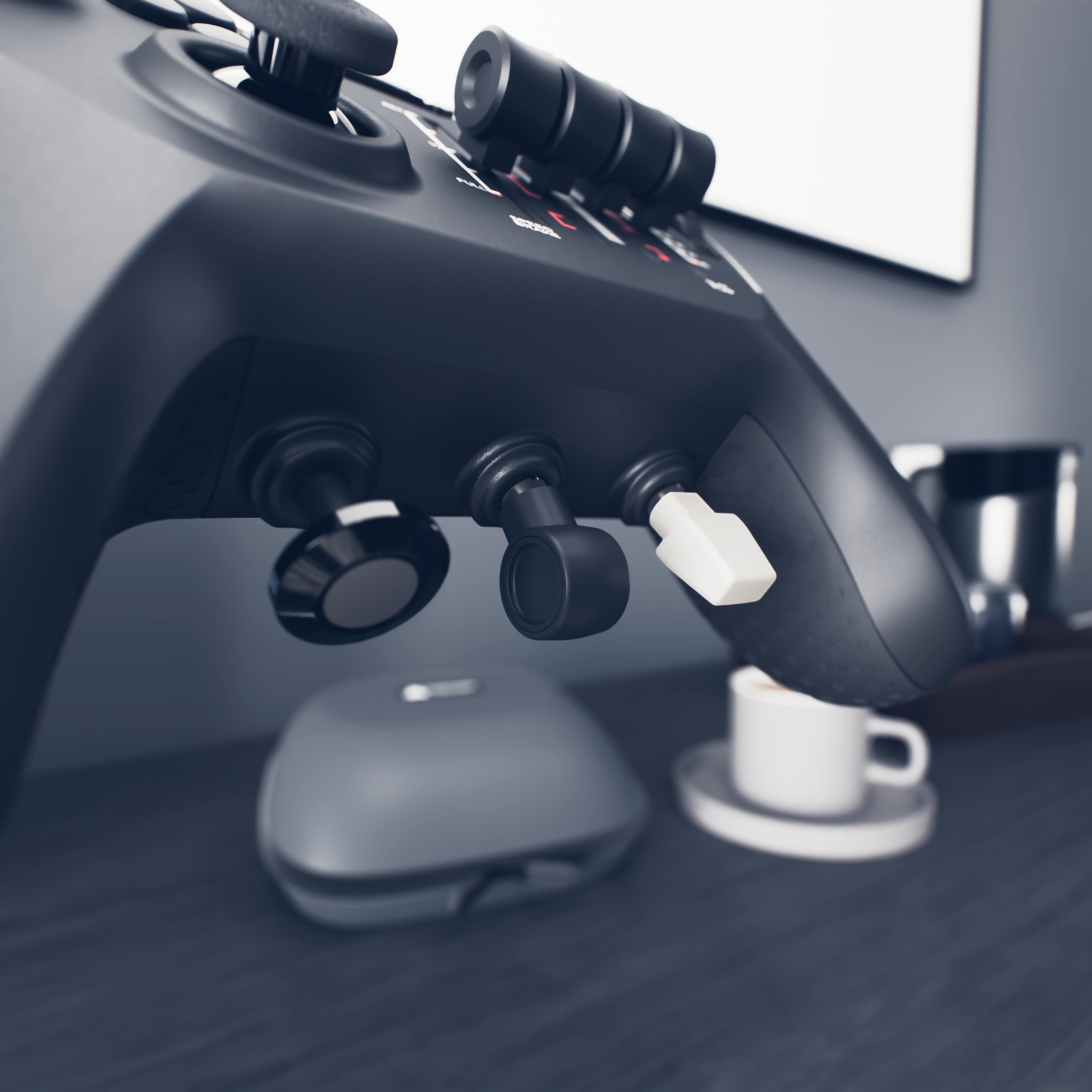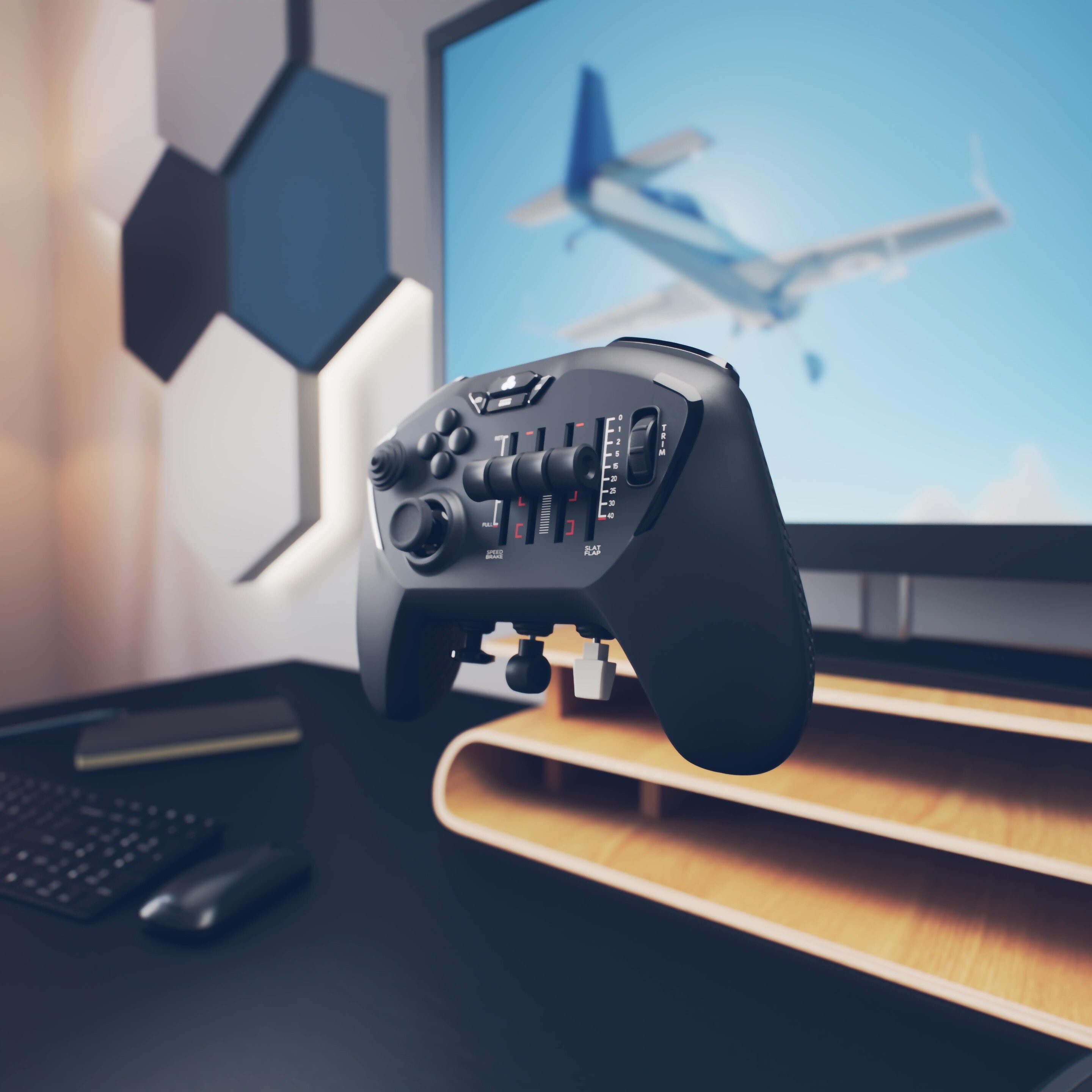 Et malgré un format qui évoque celui d’une manette traditionnelle, l’Echo Aviation Controller s’appuie sur des solutions techniques issues du matériel de simulation dédié. Le joystick analogique par exemple est équipé de capteurs à effet Hall, afin d'assurer le contrôle du pitch et du roll avec précision et durabilité. Le contrôle du lacet est quant à lui confié à un système de palettes arrière fonctionnant en opposition, ce qui permet de simuler l’action du palonnier sans recourir à des pédales externes. Une approche qui offre une alternative cohérente pour un usage compact et polyvalent, même si elle n’égale pas un dispositif dédié en termes de sensations. Les 4 manettes de gaz indépendantes, associées à une molette de trim continue, permettent quant à elles de couvrir un large éventail d’aéronefs, du monomoteur au multimoteur. Sinon, l’un des apports notables de l’Echo Aviation Controller réside dans la présence de commandes physiques dédiées aux fonctions essentielles de l’avion, telles que le train d’atterrissage, les volets ou le frein de stationnement. En limitant le recours au clavier et aux mappages complexes, Honeycomb cherche en effet à préserver la continuité de l’expérience de vol.