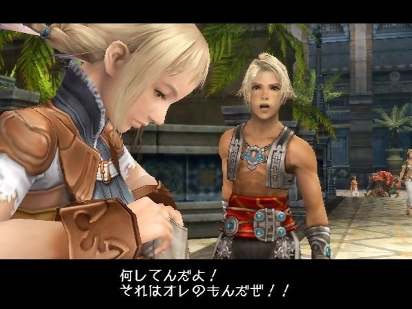 Les images accompagnant cet article montrent les personnages principaux du jeu : le héros, Vaan, est le petit blond torse nu en position assise, son amie Penelo est la fille en grandes bottes de cuir, la princesse Ashe est la jolie minette en minijupe rose (on s’attend donc à quelques histoires de jalousie entre les deux filles), et le pirate Balthier est l’homme à la carabine accompagné de son associée Fran, la fille aux oreilles de lapin armée d’un arc.
