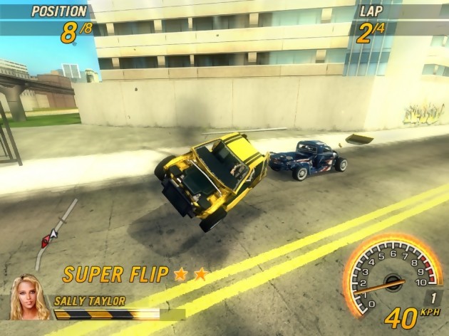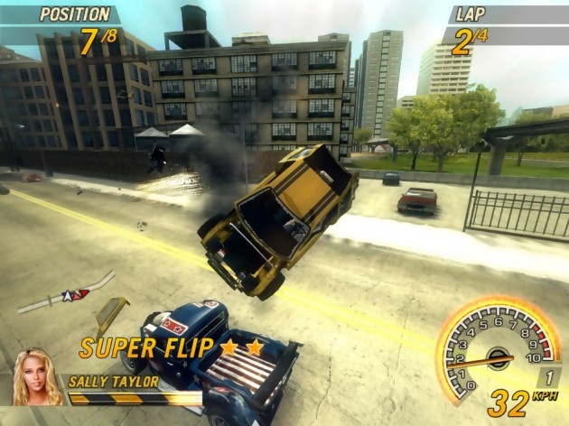 Gros succès commercial malgré la sortie à l’époque de Burnout 3, FlatOut repart pour un tour sur PC, PlayStation 2 et Xbox avec FlatOut 2 toujours développé par BugBear Entertainment. Pour ce nouvel opus, le jeu s’offre un tout nouveau moteur graphique mais également des modes de jeu inédits notamment en ce qui concerne les mini jeux d’éjections de pilotes. Pour ce qui est des courses plus particulièrement, celles-ci se dérouleront aussi bien en pleine nature qu’en ville comme nous le prouvent ces nouvelles images affichant pour la première fois l’HUD. FlatOut 2 sortira le 7 juillet prochain.