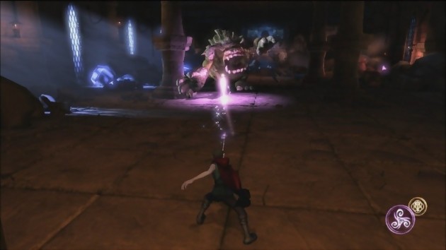 Dans la séquence de jeu présentée, notre jeune sorcier fait son arrivée en grandes pompes dans une sorte de palais en ruines à travers une porte bleue magique à la Stargate. En explorant les alentours, il faudra affronter de curieuses bestioles vertes et geignardes sur une bonne partie du chemin, avant d'atteindre une anti-chambre et piquer une potion magique à un squelette qui n'en aura plus vraiment besoin. Un cul-de-sac ? Que nenni, Sorcery c'est un peu Alice au pays des Merveilles : une fois la potion verte correctement shakée et avalée (après avoir effectué les mouvements comme il se doit, c'est-à-dire comme si la bouteille était dans votre main), voilà notre sorcier transformé... en rat d'égout. Pas très classe certes, mais cela lui permet de se glisser dans des endroits impossibles d'accès pour un être humain, passant dans des trous de souris et crapahutant sur des corniches. De l'infiniment petit, le joueur aura la possibilité de passer à l'infiniment grand, en se transformant, plus tard, en énorme troll gentiment dévastateur. "Gentiment", car il ne faut pas oublier la cible de Sorcery : un très grand et jeune public, prêt à bouger le poignet sur leur canapé pour jouer. Certes, la comparaison avec la Wiimote est inévitable. Même façon de jouer, même besoin d'effectuer les gestes réels afin de faire réagir le personnage à l'écran, même possibilité d'augmenter la puissance de tir en mettant plus de force dans le mouvement. Pourtant, le résultat est ici assez bluffant, notamment au niveau de la précision de détection, chose qui pêche habituellement du côté de la console de Nintendo. Très dynamique, Sorcery se révèle aussi instinctif qu'efficace, complétement adapté aux spécificités du PlayStation Move, avec un mode jeu forcément impossible avec des manettes traditionnelles. Un mouvement en haut à droite pour dégager une caisse, en bas à gauche pour se débarrasser d'un ennemi, un coup sec et rapide vers le bas pour déclencher une énorme secousse dévastatrice sur les ennemis... Bref, un gameplay simple, assez naturel et rapidement acquis, afin encore une fois, de faciliter l'accès au jeune public. Il suffira d'appuyer sur le bouton "Move" pour faire apparaître le menu des sorts, diriger ensuite le PSMove vers l'icône choisie pour sélectionner son option, puis glacer ou enflammer les bestioles, ériger un mur de feu, ou encore créer un tourbillon pour d'entraîner les ennemis dans un ravin, le tout, bien sûr, en effectuant concrètement les mouvements nécessaires. Vous pourrez également tout cumuler ! Il existera en effet de nombreuses combinaisons entre les différentes attaques. Rien de plus simple, donc, d'autant que l'action se gêle lors du choix de sorts : vous ne serez donc pas attaqués par les bêbêtes lorsque vous êtes sur les menus. Sympa pour le grand public, frustrant pour les gamers qui trouveront sans aucun doute le jeu rapidement trop facile.