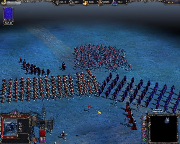 Bref, pour nous, l’équilibre entre les joueurs STR et les autres avec une seule unité se fera sans doute à l’avantage des seconds. Mais après tout, chacun peut opter pour un héros unique et s’affronter des heures avant de déterminer un vainqueur. Le plus grave problème concerne le mode solo orienté STR. L’ordinateur est vraiment doué et ne commet aucune erreur. Faire une percée dans son camp relève de l’exploit. Si juste avant la sortie du jeu, les développeurs pouvaient un peu calmer l’animosité que possède l’I.A. envers l’ensemble des joueurs, nous leur en serions très reconnaissants. Car nous avons pu nous exercer sur un jeu au contenu vraiment très riche : des objets magiques comme s’il en pleuvait, des sorts de fous furieux qui illuminent tout l’écran, quatre races aux gameplays très différents, des graphismes d’une précision absolue et un rythme à couper le souffle. C’est juste trop dur, pour le moment.