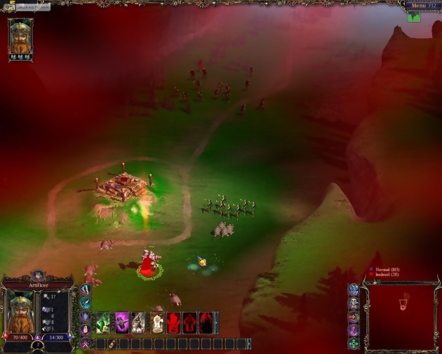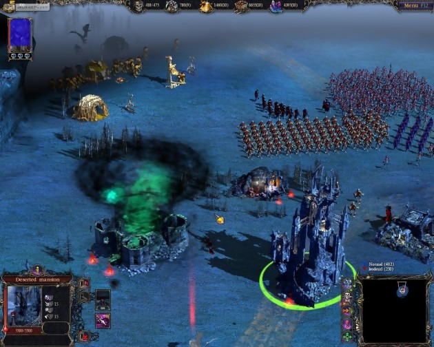 Pour le deuxième, c’était autre chose. Surtout qu’il se faisait aider par l’attaché de presse de GSC Game World. Il s’est engouffré directement dans le jeu de rôles. Pendant la construction de ma base, il avait eu le temps de gagner pas mal d’expérience et c’est un héros gonflé aux testostérones qui est apparu devant mon camp. Le flot continu d’unités et les tourelles ne pouvaient rien y faire, il fallait quelque chose de plus musclé. Pire ! Toutes les victimes sortant des structures lui faisaient gagner de l’expérience. Si les premières minutes laissaient entrevoir un statu quo, la suite allait donner l’avantage au Materazzi qui se trouvait à côté de moi. OK, j’ai perdu mais de ces quelques parties, quelques déductions s’imposent : si un début de partie est assez difficile avec un héros esseulé (il faut choisir les monstres se trouvant sur la carte avec prudence et parcimonie), il n’en va pas du tout de même à la fin où la précieuse unité devient un Gandalf en puissance, terrassant plusieurs dizaines d’unités en invoquant un seul sort. Et que se passe-t-il quand deux héros déchaînés se retrouvent face à face, en se remontant le moral et surtout la mana pendant des heures ? Le premier qui perd doit être le joueur qui meure d’épuisement, trois jours après le début des hostilités. Bref, en multi, dans l’état actuel des choses, je ne vois pas comment il pourrait être plus intéressant d’opter pour