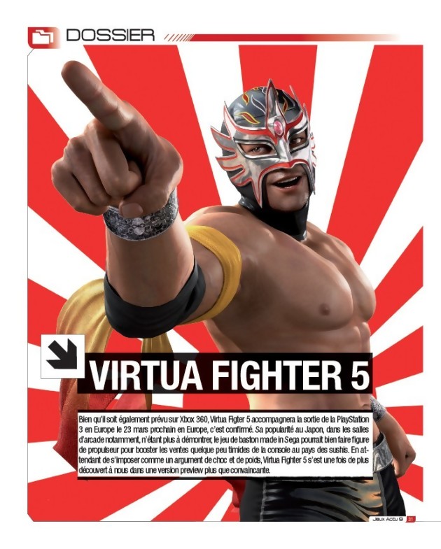 Pour le numéro 09 de JeuxActu Magazine, c'est Virtua Fighter 5 que nous avons choisi pour faire notre couverture. L'occasion de faire un point sur l'un des titres majeurs du lancement de la PlayStation 3 qui arrivera chez nous le 23 mars prochain. Nous vous avons bien évidemment consacré un dossier spécialement pour l'occasion. Vous retrouverez également un dossier de 8 pages sur les jeux à venir en 2007 qu'il faudra surveiller de près, peu importe les supports. En plus de la preview de The Darkness, nous avons eu le temps de glisser le dossier consacré au Midway Gamer's Day à notre retour de Las Vegas. A l'instar du précédent numéro, vous découvrirez pas moins d'une cinquantaine de pages de tests, avec en tête de gondole le très attendu Final Fantasy XII, Okami, God Hand, Crackdown, Supreme Commander ou bien encore Children of Mana sur DS. La rubrique DVD s'étoffe un peu plus, et dans laquelle nous chroniquons les derniers DVD à ne pas manquer ou à éviter ! Et pour terminer, Baptiste nous a concoté un nouveau dessin, toujours sur le ton de l'humour. Okami vu par Baptiste, ça vaut le détour ! Le magazine devrait être disponible la semaine prochaine dans tous les magasins Score Game de France, mais aussi les boutiques partenaires de Sodifa. Et pour ceux qui ne le sauraient toujours pas, JeuxActu Magazine est une revue totalement gratuite !
