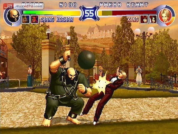 Ce midi, nous vous dévoilions des artworks inédits de The King of Fighters '94 Re-Bout sur PS2. On continue de vous parler du jeu signé SNK Playmore en divulguant cette fois-ci une belle flopée de screenshots maison capturés par nos soins. Les joueurs qui suivent la série constateront que les décors ont été redessinés entièrement et proposent désormais bon nombre d'éléments en 3D. Si les sprites des personnages sont restés identiques, ils ont néanmoins fait l'objet d'un lissage afin de rendre l'ensemble plus aguicheur visuellement. Le gameplay, quant à lui, n'a pas changé d'un iota et même le timing en matière d'enchainements de combos est le même que celui du KOF '94 original. On vous en dira davantage lors du test du jeu. A noter qu'aucune sortie de The King of Fighters '94 Re-Bout en Europe (ni aux Etats-Unis d'ailleurs) n'est annoncée pour le moment.