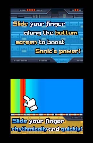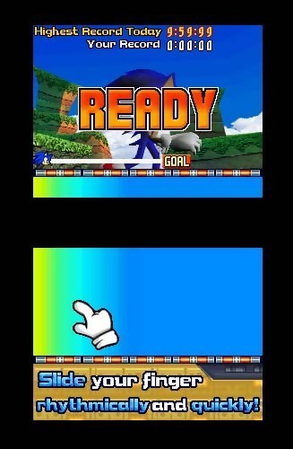 Dans cette démo en deux parties, la première d'entre elles permettait d'utiliser l'écran tactile afin de changer d'angle de vue. Dans la seconde, on pouvait faire accélérer le hérisson bleu en frottant l'écran de bas en haut et également le faire sauter, toujours grâce à l'écran tactile. Voici des images de cette démo qui préfigure un des jeux que Sega développe sur la DS.
