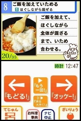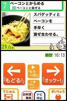 S'il y a bien une cartouche qui relancera le débat sur ce qui sépare un jeu vidéo d'un logiciel, c'est bien Shaberu! DS Oryori Navi. Quoi de mieux qu'un simulateur intéractif de recettes de cuisine pour élargir son public jusqu'à la ménagère curieuse ? Car oui, le titre que vous avez sous les yeux n'est pas un jeu à proprement parler comme peut l'être Cooking Mama qui traite lui aussi du même thème, mais bien un répertoire de recettes typiquement japonaises. De la viande aux légumes en passants par les oeufs, le tofu, le riz, les nouilles ou encore les desserts, Shaberu! DS Oryori Navi a pour objectif de vous guider visuellement et oralement dans la réalisation de votre bon petit plat. Anodin en apparence, ce titre n'est autre qu'un fier représentant de la gamme Touch Generations, qui s'est bel et bien vendu à plus de 100.000 exemplaires lors de son lancement au Japon. Dire que pendant ce temps, certaines boîtes se fatiguent encore à réaliser des jeux d'action au buget dantesque ou des RPG merveilleux. En attendant une sortie éventuelle en Europe avec des recettes adaptées en conséquence, vous pouvez retourner à votre micro-ondes.