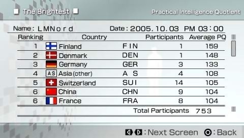 Malgré son titre involontairement amusant, PQ : Practical Intelligence Quotient est un titre on ne peut plus sérieux sur PSP. Ce jeu développé par Now Production en étroite collaboration avec Masuo Koyasu professeur de l’Université de Kyoto mettra à rude épreuve votre Quotient Intellectuel Pratique. En d’autres termes, une centaine de puzzles s’enchaîneront afin de tester votre logique et votre vitesse de réflexion. Une fois le problème résolu, votre score pourra être publié sur le service online de