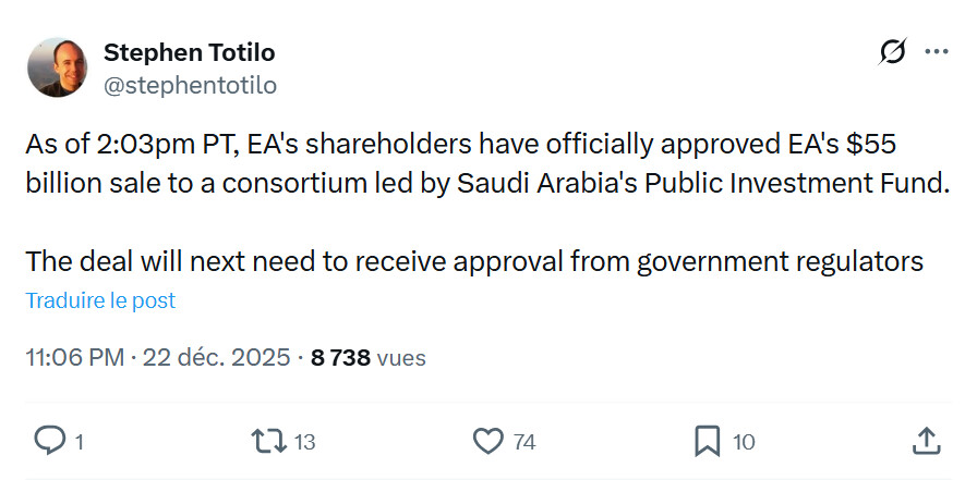Le rachat d’Electronic Arts par l'Arabie Saoudite (55 milliards) a été validé par les actionnaires...