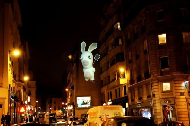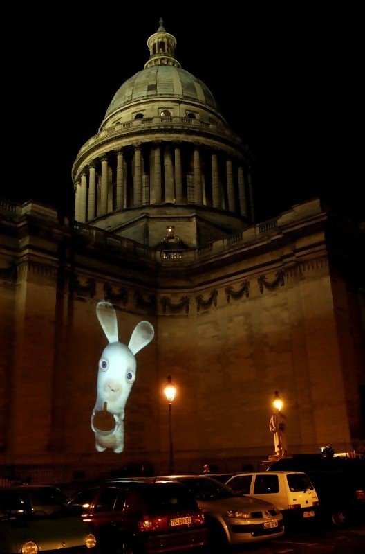 En parallèle de la sortie de la Wii hier soir sur les Champs-Elysées, Ubisoft lançait de son côté le phénomène lapinvasion, en rapport avec la sortie de leur jeu Rayman contre les Lapins Crétins, et dont le site officiel est ouvert depuis peu. Depuis hier soir donc, un camion aux couleurs du jeu se balade furtivement dans les grands boulevards de la capitale française, afin de poser des autocollants de lapins crétins à des lieux stratégiques de Paris. De même, les plus grand monuments de la capitale sont décorés par des spots projetant l'image de ces animaux complètement barjots. Bien vu !