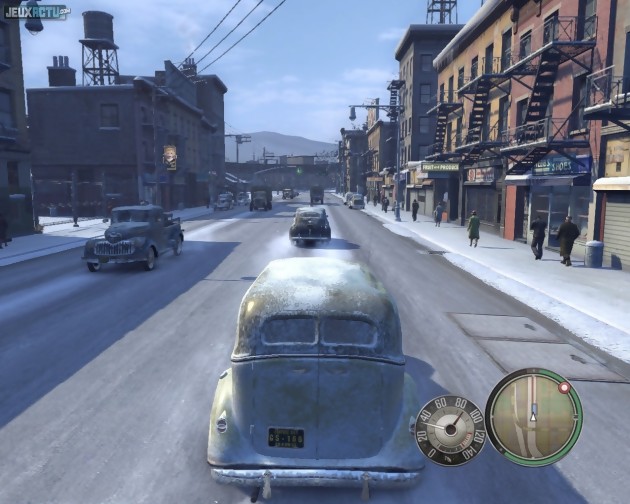 Vous le savez certainement déjà, Mafia II nous plonge dans la peau de Vito Scaletta, jeune italien nouvellement immigré dans la ville américaine fictive d'Empire Bay. Le tout début de l'aventure reste encore secret puisque la version preview que nous avons eue entre les mains démarre directement au chapitre 2 et se poursuit avec les chapitres 5, 9 et 10. Intitulé La douceur du foyer et prenant place le 8 février 1945, le premier de ces chapitres narre le retour du soldat Vito à Empire Bay, suite à une blessure de guerre. Après avoir retrouvé sa mère et sa soeur, il accepte de suivre les conseils de son ami d'enfance Joe Barbaro et réalise ses premières opérations pour la pègre locale, essentiellement constituées de vol de voitures. Pour le joueur, c'est l'occasion de profiter d'un didacticiel qui ne dit pas son nom et de découvrir la partie "automobile" du gameplay. La conduite est souple, agréable, et l'on dispose de quatre caméras différentes (en hauteur , sur le capot, en vue subjective, collée à la roue avant-gauche), auxquelles vient s'ajouter la possibilité de jeter un coup d'œil vers l'arrière. Une option fort utile pour surveiller les flics qui nous prennent éventuellement en chasse, et mieux les semer. Et en cas d'avis de recherche, un petit changement de plaque d'immatriculation suffira pour déambuler à nouveau tranquillement dans les rues. Quant au vol d'un véhicule garé et fermé à clé, il s'effectue soit en brisant une vitre, soit en crochetant la serrure à l'aide d'un mini-jeu. Les combats constituent bien entendu une autre partie majeure du gameplay, mais c'est surtout dans le chapitre suivant que nous avons pu réellement en profiter. Sa dénomination (La sulfateuse) donne une bonne idée du contenu : de l'action, de l'action et encore de l'action. Après avoir fait exploser une ou deux voitures à l'aide d'une MG 42 placée sur un balcon, Joe et Vito se retrouve lancés à la poursuite d'un gros bonnet dans une distillerie. Les caisses de whisky, les piliers ou encore les différents meubles environnants sont parfaits pour tester le système de couverture, simple et efficace puisqu'une touche suffit pour que le héros se planque automatiquement au meilleur endroit possible. Arrivés à ce stade, nous sommes d'ores et déjà pleinement convaincus de l'excellente maniabilité du jeu, à la manette comme au clavier/souris. D'ailleurs, sur PC, il est possible de zapper à tout moment entre les deux types de contrôle. Le jeu détecte automatiquement lequel est utilisé par le joueur et adapte même instantanément les indications d'aide (représentations visuelles à l'écran des boutons ou des touches).