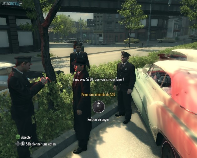 Prochaine étape de la visite : le chapitre "Une vraie boucherie". Contrairement à ce que son intitulé laisse penser, il s'agit d'un niveau qui commence de manière plutôt calme puisqu'il fait la part belle à l'infiltration. Après avoir pris un mafieux en filature quelques temps (avec interdiction de s'approcher trop franchement de son véhicule), Vito doit pénétrer discrètement dans son lieu de rendez-vous : les abattoirs. Un petit détour par les égouts plus tard, il lui faut faire profil bas afin d'éviter les chiens de garde et les gangsters ennemis. La composante infiltration est encore plus présente dans le dernier chapitre de cette version : "Service d'étage". Cette fois, Vito et Joe se prennent carrément pour Hitman et enfilent des costumes de laveur de vitres pour mieux passer inaperçu parmi leurs adversaires et poser à leur insu une bombe là où ils se réunissent. Par ailleurs, les deux premiers chapitres déjà essayés se déroulant dans les années 40, les deux derniers permettent de découvrir à quoi ressemble l'Empire Bay des années 50. Les tenues vestimentaires, les voitures, les publicités, les chansons qui passent à la radio et quelques éléments d'architecture ont évolué, et distillent un agréable sentiment de renouveau. Il est possible de s'arrêter à l'envi dans certaines échoppes (magasins de vêtements, carrosseries, restaurants...) même si, de l'aveu même des développeurs, l'accent a plus été mis sur la force et la crédibilité du scénario que sur la liberté d'action du joueur. Loin d'être un simple bac à sable, Mafia II s'annonce comme une aventure véritablement cinématographique et digne des meilleurs films de gangsters. Preuve en est qu'après ces quelques heures passées à jouer, on ne pense quasiment plus qu'à la fin du mois d'août, qui nous permettra de découvrir enfin les pans manquants du scénario. Cette impatience est peut-être un détail pour vous, mais pour des journalistes blasés ça veut dire beaucoup !