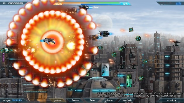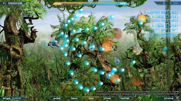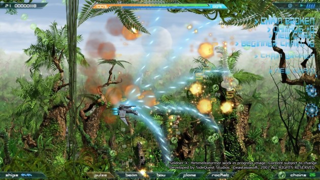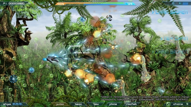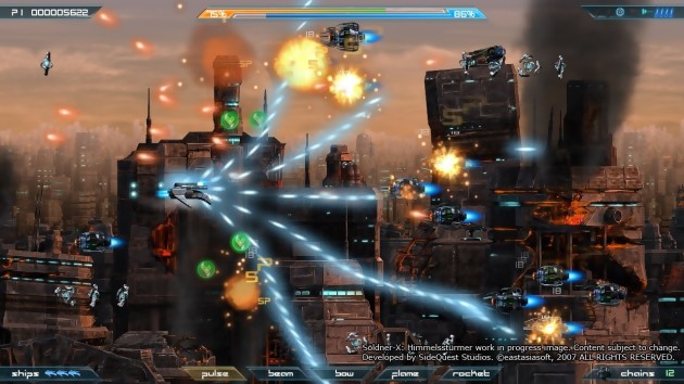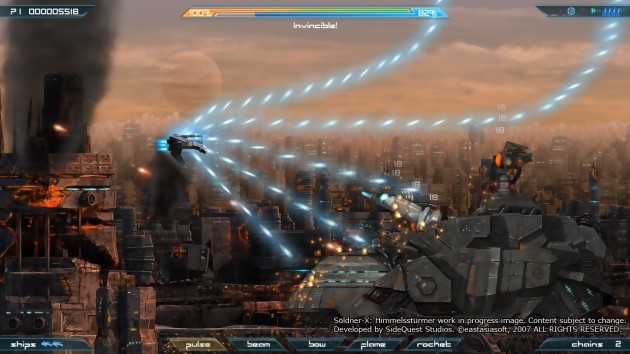 Pour la première fois dans un jeu vidéo, une boutique de vente en ligne s’immiscera dans la production d’un nouveau titre. Play-Asia, fort de son succès sur la toile, investit donc dans un jeu de shoot’em up aussi difficile à prononcer qu’à écrire : Söldner-X : Himmelsstürmer. Développé par SideQuest Studios et édité par Eastasiasoft, le titre n’a pas encore décidé sur quelle(s) plate(s)-forme(s) il sortira. A ce titre, le site officiel du jeu propose à ses visiteurs de donner leur avis et il semblerait que l’opinion publique se porte plutôt sur un jeu Xbox Live Arcade (24,4%), que sur un opus PC (22,6%), un format disque X360 (19,7%), un jeu PlayStation Network (17,3%) ou un Blu-Ray PS3 (16%). Bref, le choix n’est pas encore fait surtout que le jeu vient à peine de dépasser les 35% de son développement. Beaucoup de pourcentages en quelques phrases pour ce shoot’em up qui rendra hommage aux vétérans du genre en puisant ici ou là quelques idées à ses compatriotes qu’il s’agisse des bonus à récupérer, des chaînes à exécuter pour tenter le high-score tout au long des 12 niveaux affichés en résolution 720p. Söldner-X : Himmelsstürmer n’a évidemment pas de date de sortie à l’heure actuelle et il faudra donc patienter encore un peu pour en découvrir davantage malgré cette grosse fournée d’images.