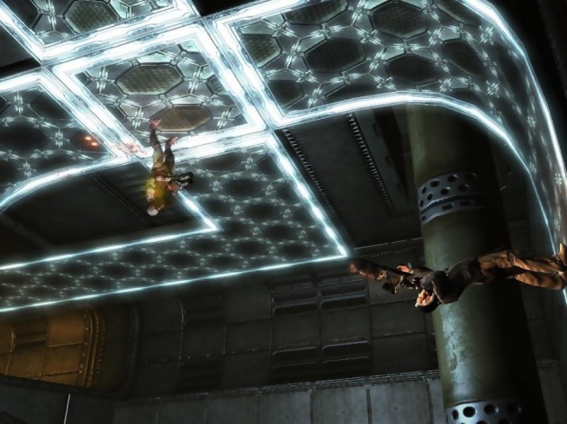 Les bases du scénario apparaîtraient complètement farfelues si elles n’étaient pas en étroite harmonie avec le gameplay. A mesure de l’avancement de la quête spirituelle de son personnage, le joueur dispose de capacités directement issues de la mythologie Cherokee ; esprit faucon, corps éthéré, arc spirituel. Loin d’être anecdotiques, ces capacités sont indispensables pour résoudre certaines énigmes et ainsi poursuivre le chemin. Même la mort du personnage s’intègre parfaitement dans le gameplay. Plutôt que d’effectuer un traditionnel respawn sur la dernière sauvegarde, le corps du personnage se trouve suspendu entre 2 mondes. Une brève bataille s’engage alors pour retourner vers le monde des vivants avec des jauges de vie et de mana qui varient selon le type d’esprits abattus. La culture Cherokee ne constitue pas la seule source d’inspiration pour les développeurs de Human Head. De nombreuses réflexions autour de la gravitation façonnent un vaisseau spatial digne de MC Escher. Certaines passerelles grimpent littéralement aux murs et identifier le haut du bas peut s’avérer une victoire somme toute temporaire. Un niveau sur un étrange astéroïde sphérique promet des sensations uniques distillées par une gravité lunaire. Le coté tridimensionnel du level design prend tout son sens lors des parties multi-joueurs, l’adversaire pouvant surgir de n’importe où. L’impression de vertige s’accentue encore par la présence de portails, parfois invisibles, qui s’ouvrent vers d’autres parties du vaisseau. Bref, tout est mis en œuvre pour désorienter le joueur qui peinera même à se rassurer en prenant en main des armes bien connues, puisque la majorité de celles-ci sont d’origines organiques. Pas de lance grenade disponible, mais des araignées extra-terrestre dont le sang s’apparente à de la nitroglycérine rempliront tout aussi bien l’office.