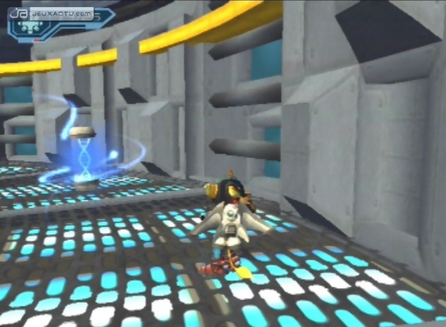 Dirigez-vous sur la gauche pour trouver un téléporteur qui vous mènera dans le centre de la ville. Une fois là-bas, trois sentinelles essayeront de vous empêcher de passer. Neutralisez-le puis reprenez votre chemin. Vous devrez par la suite exécuter une série de sauts pour éviter de vous faire électrocuter. Avancez jusqu’à arriver en bout de parcours où il faudra vous laisser planer jusqu’en bas où des ennemis vous attendent. Empruntez ensuite le chemin électrifié sans vous blesser puis utilisez l’ascenseur au bout. Après avoir détruit l’engin volant, utilisez votre grappin pour passer de l’autre côté. Sortez ensuite votre dynamo pour activer les interrupteurs [Photo 034]. Il va falloir être rapide et adroit pour passer cette phase de plateforme plutôt délicate. Le check point est situé juste après. Approchez-vous du terminal central pour lancer une cinématique. Il vous faut un nouveau vaisseau que vous pourrez récupérer sur une autre planète. Il faudra donc revenir ici plus tard. En attendant, utilisez le téléporteur afin de revenir en début de niveau. Vous verrez un point de vente à droit du téléporteur. Sautez sur la plateforme en face pour rejoindre pour ainsi vous procurer une nouvelle armure pour la somme de 25000 écrous. Plus loin, vous verrez des interrupteurs à activer à l’aide de votre dynamo [Photo 035]. Sautez sur les plateformes qui apparaîtront pour atteindre la rive suivante. Vous serez alors attaqué par des robots doté de double guns ainsi que par des sentinelles. Après vous en être débarrassé, utilisez le grappin pour vous balancer sur la plateforme en face. Plus loin, vous devrez combattre une horde de robots, sortez l’artillerie lourde pour ne pas trop perdre d’énergie. Escaladez ensuite l’échelle puis accrochez-vous au crochet juste après et vous balancez sur la partie suivante. Nettoyez la pièce suivante pour être tranquille puis servez-vous du swingueur pour atteindre la plateforme située de l’autre côté du point d’eau. Plus loin, vous allez être de nouveau embêté par des robots armés de double guns. Détruisez-les puis escaladez la petite tourelle pour atteindre le point d’accroche [Photo 036] qui vous permettra d’utiliser votre swingueur et arriver de l’autre côté. Enchaînez par un double saut et laissez-vous planez sur la partie suivante pour ensuite être attaquer par d’autres ennemis. Au bout à gauche, usez de votre dynamo pour faire apparaître des plateformes qui vous permettront de passer cet espace vide. Il faudra jouer les Tarzans juste à droite pour arriver sur la plateforme située tout au bout de votre horizon [Photo 037]. Le check point est placé juste après ce passage. Contemplez la cinématique pour être ensuite amené sur une nouvelle planète.
