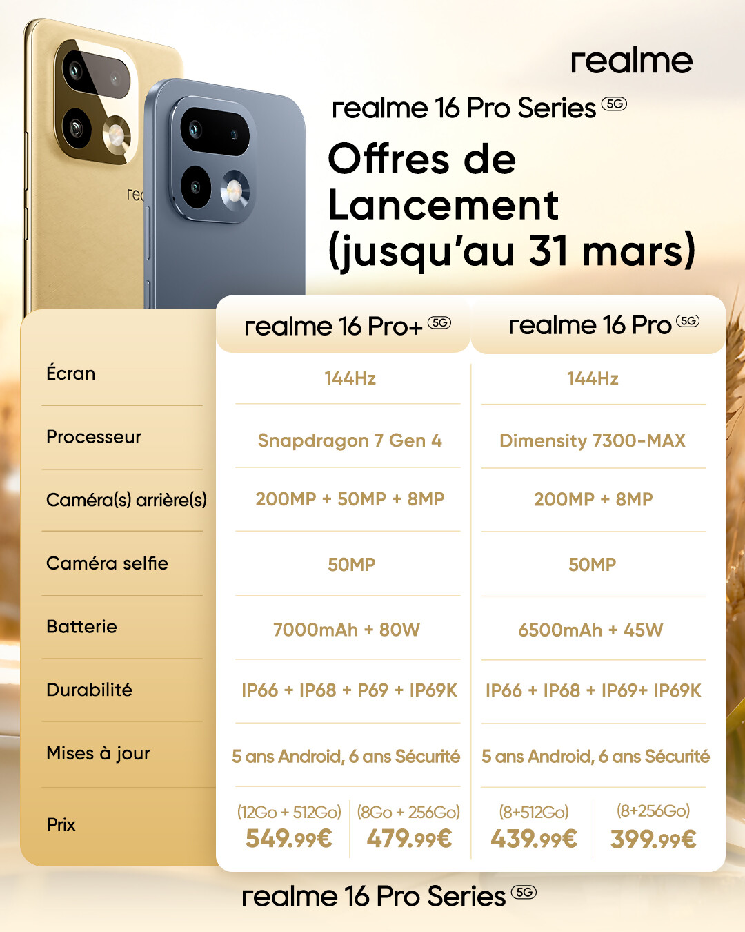 Le realme 16 Pro+ sera proposé en Master Gold et Master Grey, avec deux configurations :