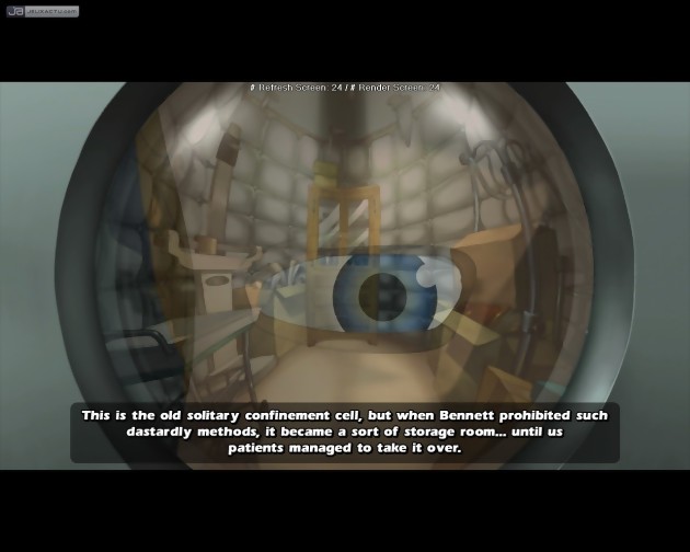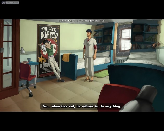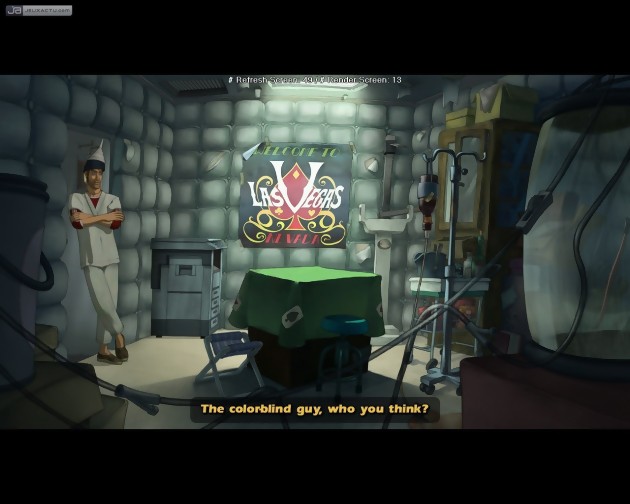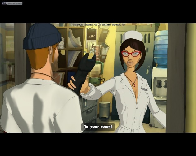 Tout comme ses deux prédécesseurs, ce Runaway assume totalement son statut de bon gros jeu d'aventures classique. Dialogues à choix multiples, ramassages, combinaisons et utilisations d'objets constituent le cœur du gameplay. On n'imaginait pas vraiment qu'il puisse en être autrement, mais cette pré-version nous a également rassurés sur l'ambiance et l'humour du jeu, manifestement à la hauteur de l'excellente réputation de la série. Un exemple parmi tant d'autres (du moins l'espère-t-on) : le chapitre testable se déroule dans un asile psychiatrique où d'inoffensifs excentriques semblent côtoyer des meurtriers sanguinaires. Un choix d'environnement très pertinent pour multiplier les situations loufoques. Votre partenaire de cellule étant un mime contorsionniste, vous vous retrouvez à ranger dans votre inventaire une fleur et une boîte imaginaires. Un peu plus loin, dans la salle de loisirs, une énigme ne peut être résolue qu'en faisant se rencontrer les délires d'un pensionnaire âgé de 103 ans avec ceux d'un doux-dingue quasiment aveugle et muet. Une tâche plus simple que ce que cette succincte description peut laisser penser, mais qui se révèle tout de même nettement plus intéressante que les poncifs du type "passer un journal sous une porte pour récupérer une clé". D'une manière plus générale, les personnages semblent tous posséder une forte personnalité et une bonne dose de charisme. Tous les indicateurs sont donc au vert et l'épisode A Twist of Fate devrait brillamment prolonger la série Runaway. En attendant sa sortie hivernale, voici quelques captures du fameux chapitre 2 que nous avons pu parcourir. La version finale proposera bien évidemment des dialogues en français et sera débarrassée des informations de debug apparaissant en haut de l'écran.