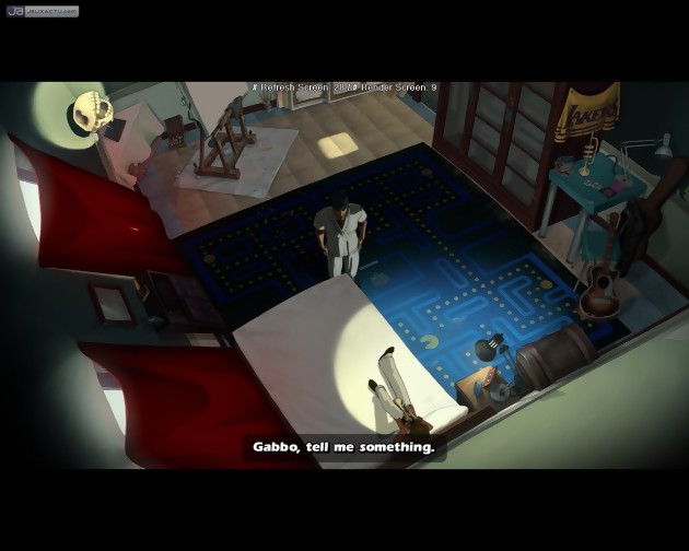 Tester une version "work in progress" demande une certaine dose d'indulgence et d'imagination. Nous nous retrouvons ainsi plongé au milieu du deuxième chapitre du jeu, sans que nous soit donné le moindre indice sur le scénario, les personnages secondaires, ou les péripéties ayant mené le héros jusqu'ici. Par ailleurs, les voix des différents protagonistes n'ayant pas encore été enregistrées, l'ambiance sonore se montre bien peu séduisante. Heureusement, le jeu ne manque pas d'atouts graphiques puisqu'on retrouve des décors et personnages qui semblent tout droit sortis d'un dessin animé, et dont le style n'est pas sans rappeler celui des Chevaliers de Baphomet. Avec une nouveauté de taille : l'introduction de la 3D et du cel-shading dans certains plans. Le mélange des techniques est franchement réussi et nous offre le meilleur des deux mondes. A savoir des décors soigneusement détaillés, ainsi que des personnages très expressifs. Restons dans la technique en évoquant les déplacements du personnage, qui s'opèrent certes de manière classique (d'écran fixe en écran fixe) mais se voient facilités par une utilisation judicieuse du double-clic. Si on réalise cette action sur une sortie, on passe instantanément au décor suivant. Mais si on l'opère à l'intérieur d'un même décor, le personnage principal se retrouve élégamment téléporté sur la zone visée, un effet de fondu enchaîné venant adoucir la transition entre les deux positions. De quoi supprimer quelques temps morts et rendre nettement plus digestes les nombreux allers et retours inhérents au genre du jeu d'aventures. L'interface se dote quant à elle d'une icône permettant de révéler toutes les zones interactives de l'écran en cours, ce qui évite de devoir chercher à la loupe le moindre pixel potentiellement cliquable. Une idée qui commence à devenir courante, mais que les développeurs auraient eu bien tort de ne pas reprendre à leur compte. Sur le fond, il ne faut d'ailleurs s'attendre à aucune révolution.