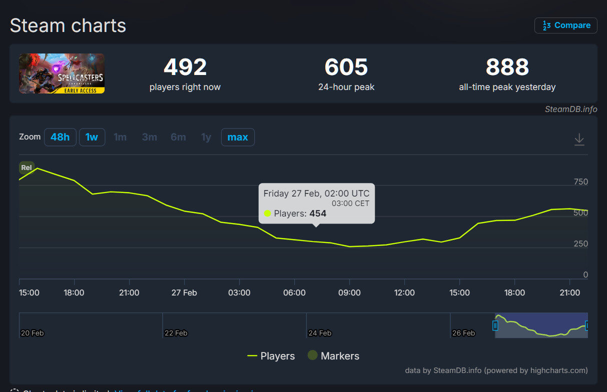 Reste que le lancement s’est fait sans grand bruit. Le pic de joueurs simultanés sur Steam a atteint seulement 888 connexions lors du premier jour, un chiffre insuffisant pour un studio de cette envergure. Il faut dire qu'entre une communication relativement sobre et une concurrence particulièrement féroce en ce moment (Resident Evil 9 Requiem et Marathon qui occupent l'espace médiatique), la fenêtre de lancement n’était sans doute pas idéale. Le plus important, désormais, ce n’est pas tant le pic initial que la capacité du jeu à construire une base solide et engagée sur la durée. Dans un marché multijoueur saturé, survivre demande plus qu’une bonne idée : il faut du suivi, de la réactivité et une communauté qui se sent réellement écoutée. Spellcasters Chronicles entre donc dans une phase décisive, car l'early access n’est pas une ligne d’arrivée, mais le point de départ d’un long processus. Reste à voir si cette aventure collaborative saura trouver son rythme, et surtout son public.