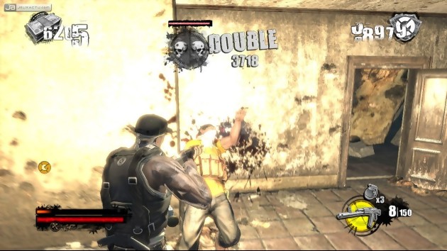 Tout commence d'ailleurs à la sortie d'un concert où notre héros à la casquette de côté vient de se faire ovationner par un public en délire (certainement le gilet pare-balles qu'il porte même en chantant et peut-être même en dormant). Malgré cette reconnaissance, 50 Cent garde les pieds sur Terre et se dirige dans les coulisses pour aller voir l'organisateur du show et lui réclamer son cachet. Un brin cupide le Curtis James Jackson ? Ca ne fait aucun doute. Mais fauché comme les blés, son employeur lui propose en échange de lui donner un crâne incrusté de diamants d'une valeur inestimable. Nos deux hommes trouvent donc un terrain d'entente. Seulement voilà, sur le chemin du retour, son humvee se fait braquer par une bande de pillards qui lui vole - forcément - le précieux objet. Pas content, 50 Cent part à leur trousse, bien décidé à récupérer son dû. Bon, le scénario ne fait pas vraiment dans la finesse et tient sur un confetti mais là n'est pas le propos puisqu'il s'agit d'un prétexte pour justifier quelques heures de joyeuses fusillades. Par ailleurs, pour éviter de réitérer les mêmes erreurs que le premier épisode, 50 Cent : Blood on the Sand a joué la carte de la sûreté et s'est contenté de piller les idées chez les autres. Ceux qui ont joué aux deux Gears of War trouveront de fortes similitudes avec ce dernier puisque Curtis Jackson peut désormais se planquer derrière des éléments du décor lors des fusillades. A l'instar de Marcus Fenix, il peut passer d'une planque à une autre d'un simple mouvement d'épaule, tirer dans le tas histoire de faire du bruit mais aussi franchir des obstacles pour mieux surprendre l'ennemi. Forcément, en recopiant sur le voisin, et a priori le premier de la classe, aucun doute à avoir, le gameplay tient la route. A cela s'ajoute un partenaire que le CPU se chargera de diriger pour ceux qui préfèrent se la jouer solo. En effet, durant toute l'aventure, vous serez accompagné d'un membre de la G-Unit choisi au début parmi Tony Yayo, Lloyd Banks et DH Whoo Kid. À tout moment, un ami peut vous rejoindre en ligne pour en prendre le contrôle. Certains passages nécessitent la collaboration des deux joueurs, comme pour escalader certaines parois ou soulever de lourds rideaux de fer. Rien de bien transcendant, si ce n'est donner la sensation de ne pas évoluer seul dans ces décors souvent en ruines et quelques peu répétitifs, il faut le souligner.