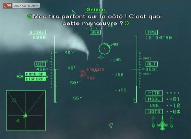 “Avion” rime souvent avec “radar” et ce dernier vous sera particulièrement utile pour vous repérer sur la carte, mais également et surtout pour indiquer la position de vos alliés (en bleu), de l’escadrille sous votre commandement (en vert) et de vos objectifs (en blanc). Il faudra alors se méfier comme la peste des avions émettant un champs magnétique qui brouille votre radar, vous rendant aveugle par la même occasion. Chacune de vos victimes vous octroie une certaine somme d’argent qui vous permettra d’acheter un nouvel appareil, et de même, chaque vaisseau répond à un quota d’ennemis abattus. Une fois ce quota atteint, un nouveau prototype d’appareil devient disponible dans la boutique. Au total, on pourra faire son choix parmi une trentaine d’avions dont les célèbres F-117, MIG et autre Rafale. Vous vous en doutez, ces derniers n’offrent pas les mêmes performances et vous pourrez en juger par leurs caractéristiques : vitesse, mobilité, stabilité, solidité, performance air-sol / air-air, capacité de charges de missiles et armes complémentaires. En sus, chaque appareil est armé d’une mitraillette suffisamment puissante pour percer le blindage de vos opposants. Pour les prochains vols, vous pourrez donc choisir votre machine et également celle de votre escadrille au grand complet - et il faudra penser à les équiper au préalable - afin d’établir une stratégie adéquate à vos objectifs. On aurait souhaité que le travail de localisation bénéficie d’un peu plus de soin. Non pas qu’elle soit de mauvaise qualité, mais les dialogues sont uniquement doublés en anglais et on devra se contenter de la traduction française en sous-titrage. Cela s’avère préjudiciable surtout durant les batailles, où l’on nous abreuve de textes que l’on doit parfois ignorer dans le feu de l’action, faute de temps, et qui réclame nt parfois notre avis sur une action à effectuer (qui se résume à un simple Oui/Non). On préfère vite se concentrer sur les manœuvres, sans oublier les directives à donner à vos coéquipiers, qui assurent des combats extrêmement dynamiques. Les amateurs de dogfights ne seront alors pas déçus.