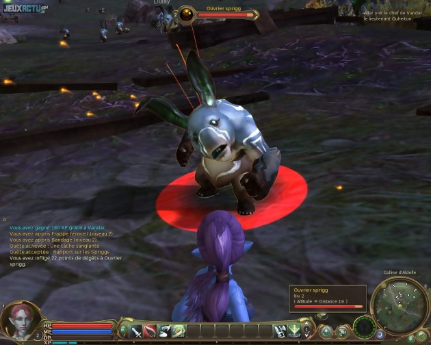 Qu'il s'agisse de quêtes ou de missions, le but reste généralement d'amener tel objet à tel personnage, d'éradiquer tel ennemi ou de récolter tant de trophées. Le jeu ne tente quasiment jamais de surprendre et ne fait appel que trop rarement à des scripts pour créer des évènements marquants. On passe donc le plus clair de son temps à abattre à la chaîne des foules de mobs, à la manière d'un farmer chinois. C'est certes une constante dans les MMORPG, mais elle est ici poussée à son paroxysme. Par la nature même des quêtes d'une part, mais aussi parce qu'elles ne suffisent parfois pas pour atteindre le niveau nécessaire à la résolution des suivantes. Etant donné qu'il est très difficile de lutter contre des créatures de niveau n+2, il faut donc de temps à autre se résoudre à faire de l'XP pour faire de l'XP... Pour nous faciliter la tâche, les mobs ont tout de même le bon goût de réapparaître rapidement et d'offrir un taux de loot élevé, en trophées de quêtes comme en objets annexes. On peut également voir dans le système d'évolution du personnage une preuve supplémentaire d'un certain manque de finesse de la part du jeu. En effet, passer un niveau n'octroie aucun point à dépenser pour améliorer les caractéristiques du héros, qui évolue automatiquement et qu'on ne peut donc pas vraiment façonner à sa guise, même si le système de "stigmas" accessible à partir du niveau 20 permet tout de même une certaine spécialisation. Dès lors, on perd quasiment la dernière notion de jeu de rôle qu'il pouvait rester dans le concept de MMORPG... Et la course à l'équipement prend une importance encore plus grande qu'à l'accoutumée puisque le matériel devient quasiment le seul moyen de modifier ses statistiques, à commencer par la plus originale d'entre elles : le temps de vol autorisé. Les ailes des personnages ne sont pas que décoratives et permettent effectivement de voler dans les airs en toute liberté.