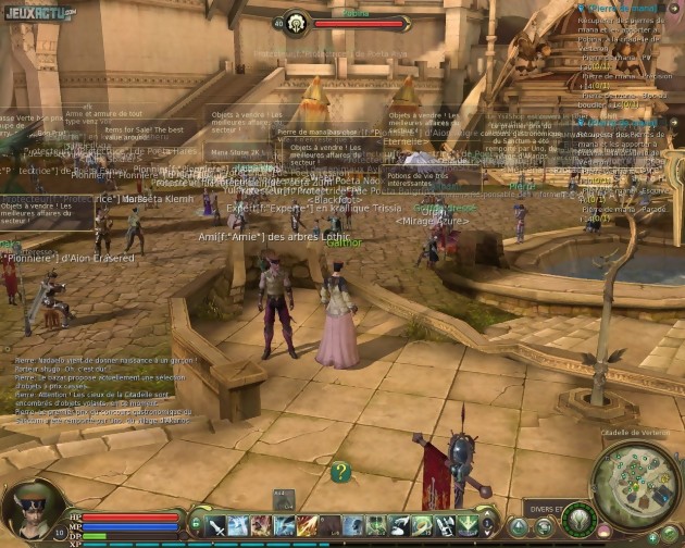 En jeu, on ne croise donc pas une armée de clones mais des jeunes éphèbes tout droit sortis d'un manga, des vieux moustachus de l'époque victorienne, des toutes petites filles aux couettes roses ou encore des obèses de plus de deux mètres... Les vêtements et armures récoltés peuvent quant à eux être teintés de différentes couleurs afin de se distinguer. De toutes manières, la plupart sont tellement classieux d'origine qu'on les porte avec fierté même si d'autres en font autant. Les décors ne manquent pas non plus d'attrait puisque les sublimes paysages rappellent immanquablement ceux de Guild Wars, tandis que les deux capitales (Sanctum pour les Elyséens, Pandemonium pour les Asmodiens) possèdent chacune une architecture unique qui ne peut que séduire et impressionner. Dans ce flot d'élégance, seules quelques textures exagérément étirées, donc disgracieuses, font tâche. Dans l'ensemble, Aion reste un véritable ravissement pour les yeux. Ce n'est pas là la seule qualité du jeu, qui sait également se montrer convivial. Le didacticiel intégré se déclenche automatiquement dès que l'on effectue une action pour la première fois et affiche des petites vidéos explicites. Mais surtout, les noms propres présents dans les descriptifs de quêtes cachent en réalité des liens hypertexte, qui permettent non seulement de comprendre rapidement de qui ou quoi on nous parle grâce à une définition succincte, mais aussi de marquer sur la carte la localisation exacte du personnage ou du lieu mentionné. Cette fonctionnalité éminemment pratique rend service à de nombreuses reprises et simplifie la réalisation des objectifs. Ceux-ci prennent la forme de quêtes classiques totalement facultatives ou de missions, nécessaires à l'avancement de l'histoire et à l'évolution du personnage. Dans ce cas, elles sont généralement introduites par une minuscule cinématique réalisée avec le moteur 3D du jeu et bénéficient d'un onglet à part dans l'interface. Ce statut spécifique ne leur confère hélas pas une grande originalité.