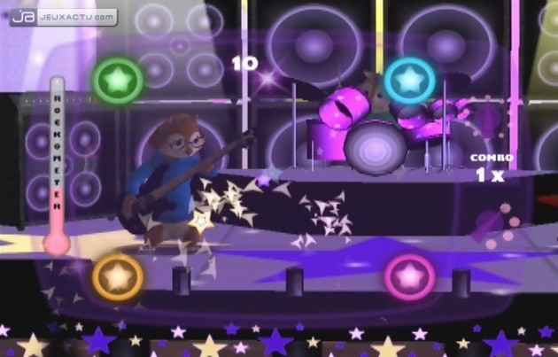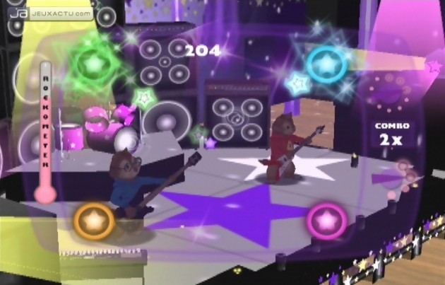 On ne vous fera pas le supplice de vous parler de la genèse d’Alvin et les Chipmunks, simplement pour gonfler les paragraphes de ce papier, d’autres sites s’en sont déjà occupés. Quant à l’histoire du jeu, elle s’inspire bien évidemment du scénario assez risible du film qui consiste à faire de ces trois écureuils d’une absolue banalité des stars du rock, et ce malgré leur voix atrocement aiguës. Evidemment, avec une histoire qui a un lien direct avec la musique et tout particulièrement le rock, difficile pour les membres du studio Sensory Sweep de ne pas aller loucher du côté de la concurrence actuelle. Pas étonnant alors de voir des similitudes avec la série Guitar Hero, aussi bien dans ses mécanismes qu’au niveau de certains aspects du gameplay. Mais en l’absence de guitare ou autres instruments de musique, l’intérêt tombe subitement à plat, surtout quand on se rend compte que c’est à l’aide des quatre boutons de tranche qu’il va falloir valider les pseudo-notes de musique qui défilent à l’écran. Pour ce faire, rien de plus simple (du moins sur le papier), puisque l’objectif consiste à valider les étoiles qui défilent du centre de l’écran vers les quatre cercles situés aux quatre coins de l’écran. Ces derniers se distinguent par leur couleur (vert, bleu, orange, mauve) et chacun de ces cercles correspond à une touche bien précise de la manette. Evidemment, tout porte à croire qu’il est juste question de rythme pour pouvoir s’immiscer complètement dans l’ambiance folle du jeu. A priori oui mais a fortiori, ce n’est pas le cas ici. A l’instar du Boogie d’Electronic Arts, à aucun moment les notes qui défilent à l’écran ne sont en rythme avec le tempo, si bien qu’on se retrouve assez souvent déboussolé. Pire encore, l’habillage ultra coloré se mélangeant avec les notes de couleur, il est assez difficile de se repérer dans ce capharnaüm visuel. Ceux qui comptaient se rattraper sur la playlist risquent de déchanter puisque dans un souci d’authenticité, les concepteurs du jeu ont voté à main levée la reprise de tous les morceaux par les Chipmunks grand consommateur d’hélium, ce qui leur procure cette voix si stridente et insupportable. Histoire de continuer dans cet élan de médiocrité – et le mot est faible – sachez également que les modes de jeu se comptent sur les doigts d’une main et que la durée de vie ne dépassera pas la journée de jeu. On pensait qu’Electronic Arts avait touché le fond avec Boogie, mais avec Alvin et les Chipmunks, le jeu musical s’enlise dans la vase…