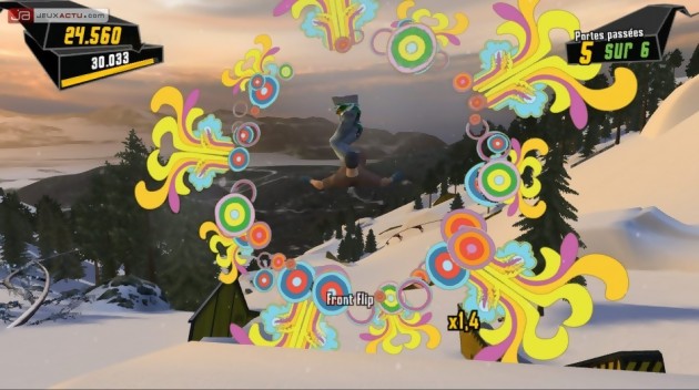 Genoux fléchis sur le snowboard, c’est sur des flancs de montagnes entiers et totalement accessibles que vous allez vous rendre de rendez-vous en rendez-vous pour relever les défis de vos potos cumulant à peine le QI d’une loutre une fois tous réunis. Entre style et fun, vous serez alors amené à grinder une saucisse géante, à défoncer des nains de jardin après une descente en luge, à poursuivre une bande adverse en scooter des neiges ou tout simplement à exploser le score en hors piste. Heureusement, et pour éviter une fin qui aurait pu être trop expéditive, ces objectifs ne seront pas les seuls et de nombreux défis médias ou de réputation arboreront chaque parcelle des différentes montagnes (Avoriaz inclus) pour vous permettre de progresser et de cumuler l’argent nécessaire à la mise à jour de votre équipement. Course de slaloms ou d’anneaux, score à battre et sponsor à impressionner en exécutant ses tricks préférés, les objectifs ne sont pas aussi originaux que les interfaces qui les lancent (et qui parodient au passage bon nombre de jeux, Mario et Zelda compris) et, le score ne tenant pas en compte la répétitivité de vos figures, on pourra se contenter de se concentrer sur une poignée de figures déjà maîtrisées pour jouer la sécurité.