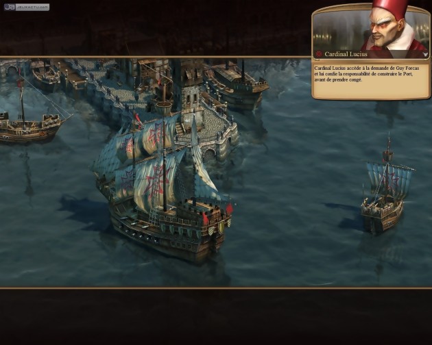 Le moteur 3D se permet même de multiples fioritures toujours bienvenues : arbres abattus qui repoussent progressivement, couche de nuages réaliste, reflets du soleil,sillage des bateaux, gouttes d'eau qui ruissellent sur l'écran quand la tempête se déchaîne... Même les scènes cinématiques font preuve d'élégance puisqu'elles ressemblent à des tableaux de la Renaissance délicatement animés. On peut notamment en profiter dans la campagne scénarisée qui, contrairement à ce qu'on peut voir la plupart du temps, ne constitue pas réellement le cœur du jeu mais fait plutôt office de didacticiel géant (comptez plus de dix heures pour en voir le bout). Quant arrive le moment de prendre en main les unités de combat terrestres, elle s'égare d'ailleurs assez maladroitement du côté de la stratégie temps réel, chose pour laquelle n'est pas faite la série Anno. A ce propos, si le système militaire a légèrement progressé (on ne contrôle plus directement chaque unité mais des campements entiers), il constitue encore un point faible du jeu. Heureusement, il est possible de complètement faire l'impasse dessus dans la plupart des cas, y compris lors des six scénarios à objectifs qui viennent seconder la campagne. Et encore plus dans le mode libre, véritable plat de résistance qui permet de jouer librement, sans fin. En revanche, quelle surprise de constater la disparition pure et simple du mode multi présent dans Anno 1701 ! L'Annopedia, cette encyclopédie hypertexte qui regroupait tous les détails sur le jeu et se révélait souvent bien utile, passe également à la trappe. Pour couronner le tout, la localisation a quelques ratés (voir apparaître "Militärischer Anführer zu Pferd" comme descriptif d'une unité a de quoi surprendre...) et, comble du malheur, le jeu utilise le système de protection Tages qui oblige à activer le produit en ligne et limite le nombre d'installations possibles. Du coup, comme Spore en son temps, le jeu se voit doté de notes lamentables dans les commentaires clients de certains sites de vente en ligne. Une forme de protestation légitime que nous éviterons d'employer ici car, quels que soient ses défauts, Anno 1404 demeure l'un des jeux parmi les plus plaisants qu'on aie vu cette année.