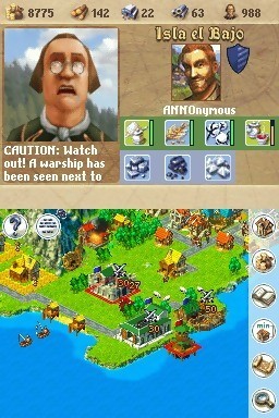 La dimension stratégique d’Anno 1701 : Dawn of Discovery est toutefois des plus limitées, et les quelques batailles que vous devrez mener contre l’envahisseur se feront de manière quasi-automatique. Il est d’ailleurs un peu malheureux que cette facette du jeu ne soit pas un tantinet plus poussée. Pour triompher, il vous suffit simplement de disposer de davantage de soldats en garnison que votre ennemi. Un peu juste. A cette exception près, la production de Keen est une belle surprise, plutôt agréable à jouer. L’interface est bien pensée et permet, en un ou deux clics de stylet, d’accéder à l’ensemble des outils de gestion et de construction. Vous sélectionnez un type de bâtiment, le positionnez sur la carte en 3D isométrique, validez et voilà, tout est prêt. On regrettera certes un certain manque de lisibilité – malgré l’existence d’un zoom –, qui entraîne quelques difficultés d’aménagement, notamment lors de l’installation des routes, et on pestera régulièrement contre l’extrême précision dont il faut parfois faire preuve pour placer ses installations, mais l’ensemble reste très intuitif. La bande son horripilante, la gestion un peu trop simplifiée des ressources (vos chers concitoyens consomment automatiquement ce dont ils ont besoin sans que vous puissiez réellement constituer de stocks), la superficie trop faible des îles, le rythme parfois très lent des parties, les défauts ne manquent évidemment pas. Mais ces quelques détails finalement mineurs n’empêchent pas Anno 1701 : Dawn of Discovery de se hisser, sans grande difficulté, parmi les meilleurs jeux de gestion de la DS.