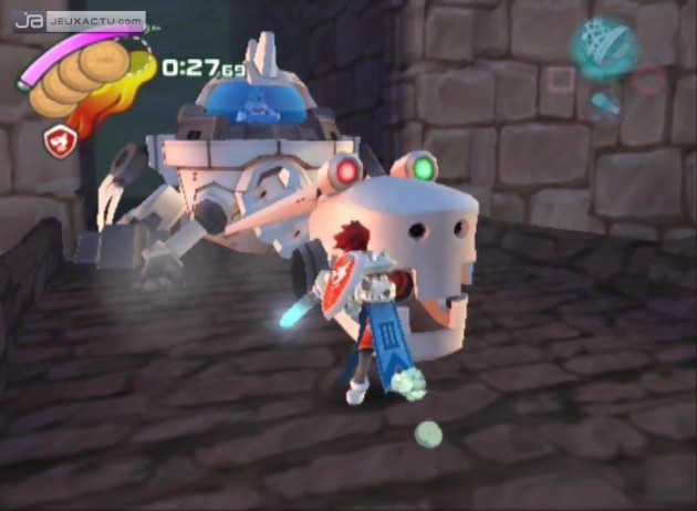 Ape Escape 3 dispose d’un panel de nouveauté qui dynamise et renouvelle une énorme partie du gameplay : les transformations ! Que vous ayez préalablement opté pour le garçon ou la fille, nos deux héros fraternels auront la possibilité de revêtir des costumes façon Magical Girl et de se découvrir de tout nouveaux attributs. Le Chevalier est intéressant pour avancer sereinement à l’aide de son bouclier, la tenue de charmeuse de génie permet d’entamer une danse disco du meilleur goût pour captiver l’ennemi, le ninja marchera adroitement sur les murs aussi bien que sur les cordes, tandis que la version cow-boy manque à peine de transformer le jeu en véritable shoot frénétique ! Pour chacune de ces transformations, la jouabilité est exploitée de façon très distincte, mais toujours fondée sur les sticks analogiques, qu’il s’agisse de pression, de direction ou de rotation. Il en va de même pour l’utilisation des gadgets, des plus fondamentaux (bâton d’attaque étourdissant, filet de capture à singe, lance-pierre) aux plus insolites comme l’hélice permettant de flotter en faisant tournoyer le stick droit, ou encore l’amusante conduite de la voiture téléguidée, qui servira souvent de cheval de Troie pour aller enclencher un interrupteur inaccessible et vous ouvrir la voie. Autre gadget à mentionner, et pas des moindre, le radar à tête pivotante, permettant de repérer les directions où se dissimulent les singes. Indispensable pour compléter le jeu à 100% et d’une utilisation fort pratique de surcroît. Bref, croyez bien que vos pouces vont prendre cher avec Ape Escape 3 ! Une vraie frénésie transformiste bourrée d’accessoires (ce n’est pas sale) qui vient enrichir une jouabilité de base assez simpliste. Mais ce n’est pas terminé, à cela on peut ajouter les déplacements aquatiques mais surtout les véhicules, qui s’en sortent avec plus ou moins de succès. Les séquences automobiles sur circuits fermés font un peu tiep, mais une fois à bord d’un robot façon Metal Slug on se croirait soudainement en train de jouer à un Armored Core tant il faut jongler de façon adroite (et pas forcément instinctive) entre les deux sticks !