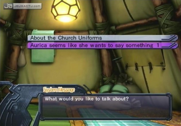 Vous l’aurez compris, Ar Tonelico : Melody of Elemia se veut proche en de nombreux points à la trilogie Atelier Iris. A l’instar des évolutions que celle-ci a pu connaître, Gust a développé cette nouvelle licence en s’appuyant sur des bases parfaitement rodées pour procéder à des ajouts par petites touches. Ici, le seul aspect original se situe dans les relations que vous entretiendrez avec vos Reyvateils. Une fois assez intime, c’est par le biais de machines dédiées que vous pourrez vous adonner à l’exploration des Cosmospheres, subconscients de vos partenaires Reyvateils. S’apparentant à des scènes de drague typiquement nippones, elles ont le mérite de proposer de petites phases de jeux cassant la linéarité dont souffre le titre pour approfondir le background de certains personnages (Lyner et les Reyvateils), débloquer de nouvelles chansons et accessoirement de nouvelles tenues qui modifieront les stats de nos chanteuses. Un système en tout cas bienvenu pour la fraîcheur et l’humour qu’il peut apporter à une intrigue un peu plus terre à terre.