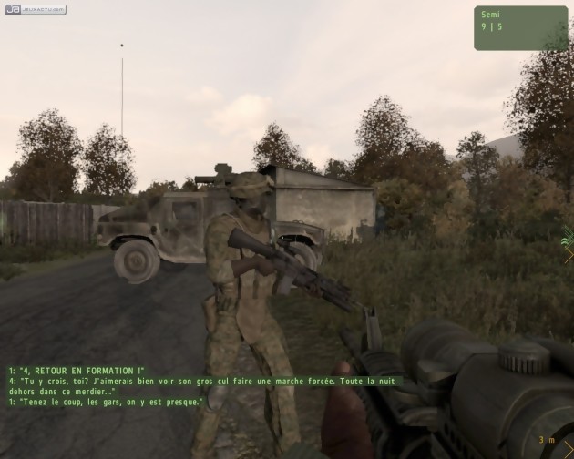 Parmi les autres améliorations figure un système de conversation qui permet de dialoguer avec certains personnages non joueurs, enrichissant ainsi le champ des interactions possibles et donc le déroulement de la campagne solo. On peut également noter l'apparition de sauts en parachute complets, où l'on doit diriger jusqu'au sol notre soldat, et l'arrivée d'une touche de "saut", qui permet de grimper par dessus les obstacles. De quoi parcourir avec encore plus de liberté les 225 kilomètres carrés de terrain mis à notre disposition ! L'aspect technique a également progressé notablement puisque le nouveau moteur 3D gère la profondeur de champ ainsi que les hautes luminosités. Habituellement, ces effets sont utilisés pour impressionner le joueur et lui en mettre plein la vue. Ici aussi, mais l'expression est à prendre au pied de la lettre puisque le soleil peut se refléter sur notre viseur selon notre positionnement, et qu'on peut se retrouver éblouis lorsqu'on quitte un endroit sombre pour un lieu situé en plein soleil. Dans un jeu où la moindre imprécision peut être fatale, ces éléments doivent être pris en compte par le joueur et dépassent donc les simples considérations esthétiques. Cependant, la qualité graphique d'ArmA II n'est pas loin d'égaler par moments celle de Crysis, et ce malgré la présence d'un effet de flou assez étrange lorsqu'on bouge rapidement la souris. Mais l'environnement géopolitique du jeu et les décors qui en découlent font surtout penser au premier STALKER. Le mode solo relate en effet des événements prenant place dans un pays imaginaire de l'ex-Union Soviétique : le Chernarus. Basé sur des relevés géographiques réels malgré sa nature fictive, il offre 350 kilomètres de routes et contient plus de 50 villes et villages ainsi que, pour l'anecdote, 726 949 arbres et 152 336 buissons. Toujours selon les développeurs bien sûr, nous ne nous sommes pas amusés à les compter un par un.