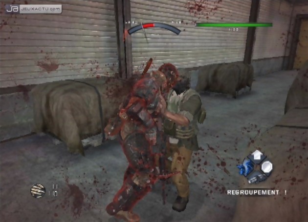 ayant bien ficelé son affaire. On pourra ordonner à son coéquipier de rester groupé, de tenir sa position pour attirer l'attention des ennemis, ou bien encore d'avancer, avec la possibilité de coupler chaque ordre avec un profil agressif ou défensif. On dispose même d'un focus à droite de l'écran, pour visualiser en un coup d'oeil l'endroit où se trouve son compagnon. C'est cette petite gymnastique oculaire qui risque d'en rebuter certains, ceux-là même qui préfèrent avoir affaire à un véritable coéquipier en fait; logique, puisque c'est là qu' prend toute son ampleur. Certains mouvements ne peuvent d'ailleurs être accomplis qu'à deux, comme le back to back (se mettre dos à dos lorsque l'on se retrouve encerclé), la courte échelle, ou bien encore se protéger avec un bouclier de fortune pendant que l'équipier, placé juste derrière, s'occupe des assaillants. Mais le geste vital demeure la réanimation, qui a subi quelques modifications depuis la première présentation officielle d'Army of Two bénéficie d'une prise en main immédiate, avec comme centre névralgique la croix directionnelle qui, conjugué à LB, permet d'accéder aux armes, et de donner des directives à son partenaire si celui-ci est contrôlé par le CPU. Pour les âmes solitaires, en toute franchise, la console ne s'amuse quasiment jamais à faire des opérations suicide. Quasiment, car il est déjà arrivé en mode professionnel, en Irak, que Rios fasse le couillon en allant affronter Ali Youssef en solo del mano. Cela reste une exception quand même, Electronic ArtsArmy of TwoArmy of Two. On ne reviendra pas sur l'ancienne manoeuvre qui consistait à ressusciter le personnage à terre, en appuyant correctement sur les boutons qui apparaissaient à l'écran. Désormais, il faut se contenter de maintenir A pour administrer les premiers soins à son partenaire, à condition de se mettre à l'abri. Pour y parvenir, il sera possible de tirer son équipier par le col pendant que celui-ci placera quelques balles entre les yeux des ennemis. Ce sont ces situations, où seul l'esprit d'équipe permet de s'en sortir, qui rendent Army of Two pas révolutionnaire, n'oublions pas de peser nos mots, mais rafraîchissant. Ecran splitté ou pas, le rythme de jeu est assez soutenu, avec quelques temps de pause accordés, essentiellement aux abords des checkpoints.