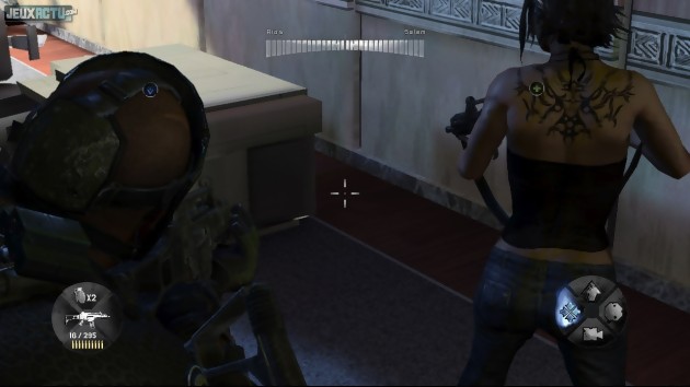 Celui d'Army of Two : Le 40ème Jour continue de s'appuyer sur ce qui avait été fait en 2008, avec quelques nouveautés pour répondre aux exigences d'aujourd'hui. En commençant par la possibilité désormais de marquer ses ennemis via le GPS, ce qui permet du coup de repérer beaucoup plus facilement les innocents retenus en otage par les terroristes, pour lesquels un système de grade a d'ailleurs été mis en place. En effet, en se saisissant d'un officier d'un rang supérieur, le reste de la troupe se rendra immédiatement. A l'inverse, si on décide de s'en prendre à un soldat d'une classe inférieure, le résultat de la manoeuvre sera beaucoup plus aléatoire. Une autre tactique d'approche consiste à simuler sa reddition, en baissant les yeux et en se mettant à genoux. En pressant la gâchette droite de la manette, on active alors une brève séquence en bullet time qui permet d'éliminer les soldats en quelques balles, avant que ceux-ci n'aient le temps d'abattre les otages. Il revient donc aux partenaires de choisir l'une ou l'autre des solutions en fonction de la situation. Libérer les civils permet non seulement de se remplir les poches, mais également de débloquer des objets pour parfaire son arsenal ; sans oublier qu'ils n'hésiteront pas à prêter main forte quelques niveaux plus tard. Bref, une idée qui relève le challenge tellement Army of Two : Le 40ème Jour n'oppose aucune résistance, que ce soit en "Occasionnel", en "Normal" ou en "Entrepreneur". L'I.A., puisque c'est de cela dont il s'agit, verse dans la naïveté excessive pour justifier la présence de l'aggromètre, qui a pris un sacré coup de vieux depuis la popularisation de la coopération. La formule est la même que dans l'Army of Two original : l'un des joueurs doit attirer l'attention des gardes afin que son partenaire puisse mieux les prendre revers.