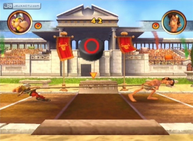 Vous pouvez inviter un pote à vous défier sur les neufs épreuves que vous débloquerez pendant votre périple en solo. Au menu : saut en longueur, course à pied, tir à la corde, crapoball (il faut envoyer le plus de crapauds possibles dans le camp de l'adversaire), roi de l'arène (on dézingue des romains à la chaîne), lancer de marteau, lancer de javelot, romainophone (on doit taper des romains colorés dans un ordre précis) et enfin course de char. Des mini-jeux plutôt amusants dans l'ensemble qui font bien entendu souvent appel au fameux matraquage de boutons tant prisés par le genre. Cependant, neuf épreuves ça fait un peu juste quand même, d'autant qu'on ne peut jouer qu'à deux. On aurait apprécié un mode quatre joueurs par exemple. Et même si le multi a beau se révéler amusant, il reste néanmoins très limité. Reste donc à nous reporter sur la réalisation. Là encore, pas d'éclat particulier. Il faut reconnaître que c'est relativement correct, étant donné qu'on retrouve en effet le moteur d'Astérix & Obélix XXL 2. On ronchonnera en revanche face au manque de variété des décors. Il y a bien quelques saccades par-ci par là, mais rien de catastrophique, ça tourne assez bien dans l'ensemble. Côté son, c'est toujours un bonheur de retrouver la voix de Roger Carel, et les petites interventions de Benoît Poelvoorde ne manquent pas d'humour (si on admet que Brutus avait l'accent belge !). Et pour ceux qui attendent le film avec impatience, grâce aux casques récoltés en tuant des Romains, vous pourrez acheter des petites vidéos présentant les différentes acteurs dans la peau de leur personnage. Etrangement, Alain Delon, qui incarne César, manque à l'appel. Pas envie d'être associé à un jeu vidéo ?