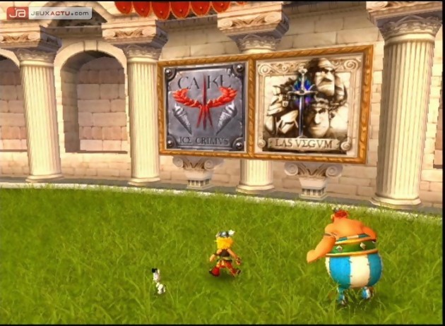 Les premières secondes des aventures que vous allez vivre sont d’emblée marquées par un coup de théâtre : Panoramix a trahi les siens et a aidé à la capture de druides au bénéfice des légions romaines de César. Visiblement, il a toute sa tête et aucun coup de menhir inopportun n’est venu le transformer en vil félon. Informés de ce coup du sort par l’espion Sam Fichaure, ersatz ante JC du héros de Splinter Cell, les deux comparses vont donc partir à sa recherche et chercher à dénouer le fil de cet invraisemblable préambule. Pour cela, il a falloir qu’ils prennent la direction de Las Vegum, parc d’attraction à thèmes situé dans la périphérie de Rome et destiné à distraire les citoyens de l’Empire. Toute cette séquence d’introduction nous met instantanément au cœur de l’esprit qui va animer tout le jeu : une grande fidélité à l’œuvre d’Uderzo et Goscinny (le trait, l’humour, les voix de Roger Carel et Pierre Tornade) tout en la modernisant et en se