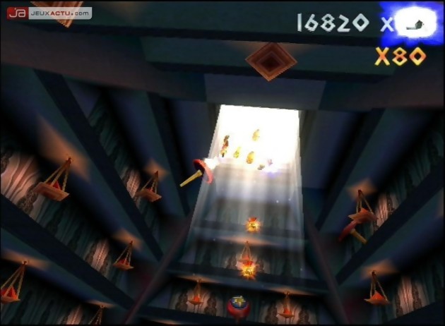 Nous n’allons pas ici dévoiler toutes les références à des personnages de jeu vidéo mais sachez que vous retrouverez pêle-mêle des clins d’œil plus ou moins appuyés à Tomb Raider, Splinter Cell, Bomberman, Tetris, Mortal Kombat, Unreal Tournament, Quake, Pac-Man, Super Mario Sunshine, Rayman, Donkey Kong, Lemmings, Street Fighter 2 ou encore Sonic The Hedgehog. Quasiment tous sont très bien intégrés au jeu et on ne peut que féliciter Etranges Libellules pour sa créativité dans le domaine. Le studio lyonnais mérite également une mention spéciale pour le travail graphique réalisé sur le jeu, tant dans le design des niveaux et des personnages que dans sa réalisation. Seul gros bémol à ce tableau d’ensemble flatteur, les musiques choisies ne cadrent pas du tout avec le jeu et ont, de plus, la particularité de devenir très vite horripilantes. Au chapitre des reproches, on pourra également ajouter des phases de combat en arènes un peu lassantes sur la durée mais qui semblent avoir été conçues pour allonger la drée de vie quelque peu faiblarde du jeu se montant à 6 heures tout au plus. On se dira que d’une part, les plus jeunes trouveront peut-être cela correct et que d’autre part, il faudra bien plus de temps pour dénicher les 30 casques diamants répartis sur les 6 niveaux du jeu, certains étant bien cachés.