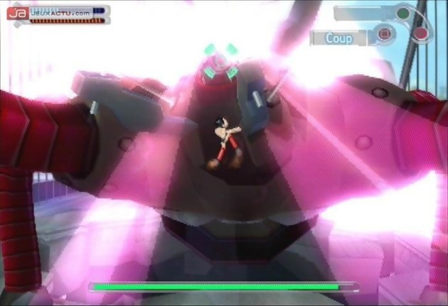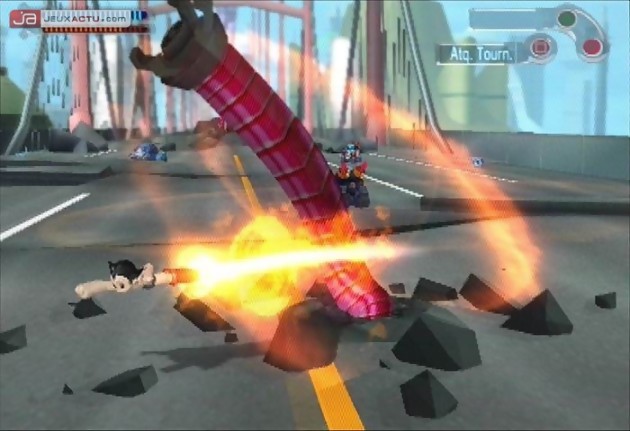 Les présentations sont faites par une superbe séquence animée qui nous introduit dans les prémices de la série, c'est-à-dire que l’on assiste à la tentative du professeur Tenma de sauver son fils et de créer le roi des robots par la même occasion. Fruit de cette expérience, Astro est une symbiose entre l’intelligence artificielle et la conscience humaine. Doté d’un sens aigu de la justice, il se découvre très vite de nouveaux pouvoirs qu’il mettra au service de cette cause. Tout d’abord, il acquiert des pieds- fusées puis une ouïe supersonique, suivi d’un doigt laser ou encore un bras canon, bref il ne lui manque plus que le café ! Tout au long de l’histoire, Astro est un peu perdu, à la recherche d’un passé qu’il n’a pas et est tenté de passer du côté obscur. Autrement dit, il hésite à assouvir les projets machiavéliques de son créateur. Une trame scénaristique qui a déjà fait ses preuves et aux multiples rebondissements. En effet, j’ai crû par quatre fois avoir terminé l’aventure, avant de me rendre compte du contraire. Une aventure un peu courte par contre, qui se chiffre à environ cinq heures de jeu. On pourra toujours s’amuser à collectionner des cartes disséminées un peu partout ou accomplir des quêtes annexes qui pourront mettre à rudes épreuves vos méninges, notamment l’épreuve qui réclame de retrouver le nom des chiens du quartier… No comment.