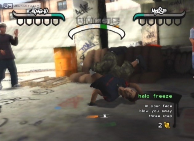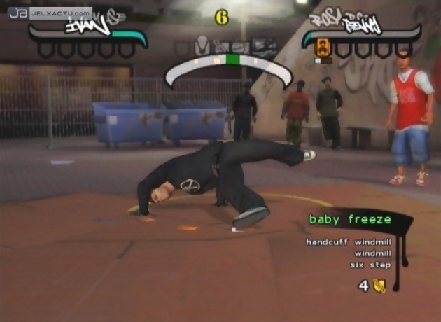 Les battles sont soumis à des impératifs de victoire. Et pour mettre toutes les chances de votre côté, il faut vous référer aux aptitudes notées sur l'écran. Au nombre de 5, ces médailles sont les critères à remplir pour espérer battre votre adversaire. Sont pris en compte la réalisation des mouvements de bases, le rythme, la créativité, la puissance et la qualité d'enchaînement des figures. Par conséquent, il faudra briller dans chacune de ces classes afin de remporter le duel en cours. Bien entendu au début de votre apprentissage seulement trois médailles apparaissent, mais plus vous emmagasinez de l'expérience, plus vous avez de médailles à conquérir. Le système de médaille fonctionne avec une jauge de réussite qui évolue selon vos performances et celle de votre adversaire. Cette jauge passe par 3 couleurs différentes à savoir l'or, l'argent et le bronze. Votre objectif est faire passer les médailles acquises par votre adversaire en dessous du bronze pour les récupérer. Une fois en votre possession, il faudra les remplir au maximum pour engranger le plus de points possibles. En bref, pour assimiler les mouvements et tout coordonner en rythme, il va falloir un peu d'entraînements.