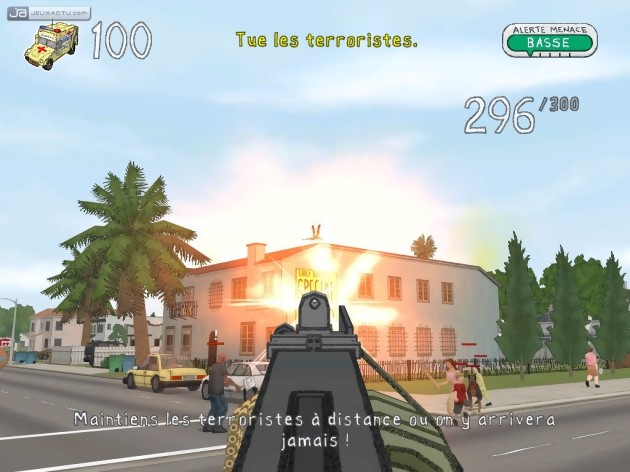 Le problème est bien entendu d’avoir laissé ces idées mûrir toutes seules sur la table sans qu’elles ne soient mieux exploitées. Car au bout du compte, il n’y a aucun gameplay dans ce jeu. Enfin si, bien sur, il y a jeu, donc il y a gameplay. Mais n’importe quel jeu Amiga parait sophistiqué en comparaison. Aucune stratégie cachée n’est à trouver pour mieux jouer. Un zombi ? Utilisez l’extincteur pour le dézombifier. Un type en feu ? Utilisez l’extincteur pour l’éteindre. Une barrière vous bloque le passage ? Cassez-la avec le cric. Voilà, en deux lignes, vous avez tous les mécanismes du jeu de Bad Day LA. Enfin, bien sur, vous tombez sur des ennemis, les terroristes : là, vous avez le fusil à pompe, l’AK 47 ou le fusil de sniper. Chaque niveau se divise en petites missions (va à l’hôpital, va voir le pompier, va chercher le fusil…) et pour gagner des points de sympathie vis-à-vis de la population, vous pouvez effectuer de bonnes actions (éteindre un type en feu, tuer un ennemi…). Le problème, c’est que l’attitude des gens qui vous entourent ne change absolument pas en fonction de vos bonnes actions. C’est tout ? Oui, à peu près… Si ce n’est que parfois, vous avez des partenaires qui vous suivent pour vous aider. Bref, si la trame de fond est excellente, elle ne dessert pas vraiment le gameplay qui se répète du premier niveau jusqu’à la fin.