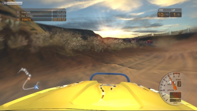 Handicapé par une réalisation sans talent et par-dessus tout obsolète, BAJA : Edge of Control ne parvient pas non plus à nous titiller du côté de sa conduite. Annoncé comme le Gran Turismo du jeu de courses off-road par ses créateurs lors du THQ Gamer's Day, le titre n’offre clairement pas de pilotage réaliste. Le bouton d’accélération enclenché à son maximum et quelques manœuvres à faire avec le stick analogique gauche suffisent à appréhender les virages avec en prime quelques déconvenues. Car si l’orientation arcade n’est en aucun cas dérangeante et rédhibitoire, proposer une conduite cohérente est en revanche indispensable pour rester sur la route. La conduite de BAJA n’est juste ni l’une ni l’autre et encore moins les deux. Les bolides ne restent jamais droits, même en ligne droite, et la moindre bosse, la moindre déformation du terrain envoie votre véhicule valdinguer sur les côtés. Pire encore, les contacts avec les véhicules adverses abiment peut-être la carlingue (avec des pièces qui se détachent comme dans un jeu LEGO) mais n’affectent en rien la conduite. BAJA est donc incohérent de bout en bout, si bien que la curiosité du départ devient une frustration sans bornes. On passe en effet le plus clair de son temps à jongler entre pilotage insensé et comprendre à la fois les bugs techniques (on passe à travers certains éléments du décor et pas d’autres) et le comportement des bolides adverses contrôlés par le CPU. C’est simple, l’intelligence artificielle a été réduite à son strict minimum. Toujours groupés et réagissant souvent de la même manière, les concurrents se content de se suivre comme de sages moutons. Même lorsque certains tracés ouvrent d’autres embranchements, ces derniers ne se lâchent pas d’une semelle, ce qui devient assez pénible à la fin.