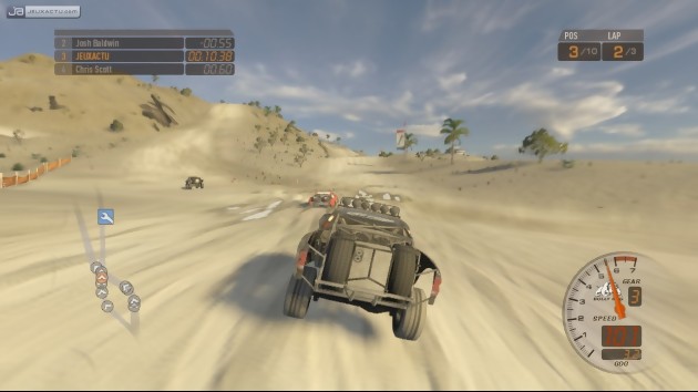 Vouloir copier le voisin, c’est une chose. Le faire bien en est une autre. Si Sony Computer Entertainment, Codemasters et désormais Disney Interactive Studios sont parvenus à s’imposer dans le paysage poussiéreux du jeu de courses off-road, c’est grâce aux bonnes idées et aux talents d’artistes désireux de conquérir le monde. Avec BAJA : Edge of Control, THQ et 2XL Games aspirent-ils au même délire ? Lorsque l’on voit le résultat final, on est en droit de se poser la question. Et il y a de quoi ! Graphiquement tout d’abord, BAJA a bien du mal à nous caresser la rétine et fait clairement pâle figure face aux autres mastodontes de la discipline. Modélisation des véhicules minimalistes, textures sans le moindre détail, environnements certes vastes et authentiques mais ô combien répétitifs et d’une monotonie affolante, effets pyrotechniques tout simplement absents, la réalisation de BAJA : Edge of Control est à des années lumière de ce que peuvent nous offrir la PlayStation 3 et la Xbox 360. Certains diront que les concepteurs ont souhaité axé leur orientation du côté de l’immensité des décors. C’est vrai, les circuits offrent une profondeur de champ assez vaste et une certaine authenticité du lieu (nous sommes dans le désert mexicain), mais avant de paraître ultra réaliste, il ne faut pas perdre de vue que nous sommes dans un jeu vidéo et que la variété prime avant toute chose. Ce n’est malheureusement pas le cas dans BAJA qui se contente d’étaler des pans de dunes de sable à perte de vue, transformant chaque circuit, chaque tracé en une balade monotone où l’absence de musiques ou de tout autre commentaire nous donne le sentiment d’assister à des funérailles.