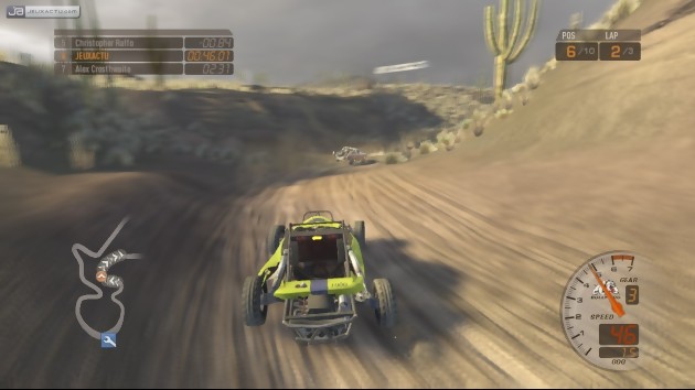 Vouloir copier le voisin, c’est une chose. Le faire bien en est une autre. Si Sony Computer Entertainment, Codemasters et désormais Disney Interactive Studios sont parvenus à s’imposer dans le paysage poussiéreux du jeu de courses off-road, c’est grâce aux bonnes idées et aux talents d’artistes désireux de conquérir le monde. Avec BAJA : Edge of Control, THQ et 2XL Games aspirent-ils au même délire ? Lorsque l’on voit le résultat final, on est en droit de se poser la question. Et il y a de quoi ! Graphiquement tout d’abord, BAJA a bien du mal à nous caresser la rétine et fait clairement pâle figure face aux autres mastodontes de la discipline. Modélisation des véhicules minimalistes, textures sans le moindre détail, environnements certes vastes et authentiques mais ô combien répétitifs et d’une monotonie affolante, effets pyrotechniques tout simplement absents, la réalisation de BAJA : Edge of Control est à des années lumière de ce que peuvent nous offrir la PlayStation 3 et la Xbox 360. Certains diront que les concepteurs ont souhaité axé leur orientation du côté de l’immensité des décors. C’est vrai, les circuits offrent une profondeur de champ assez vaste et une certaine authenticité du lieu (nous sommes dans le désert mexicain), mais avant de paraître ultra réaliste, il ne faut pas perdre de vue que nous sommes dans un jeu vidéo et que la variété prime avant toute chose. Ce n’est malheureusement pas le cas dans BAJA qui se contente d’étaler des pans de dunes de sable à perte de vue, transformant chaque circuit, chaque tracé en une balade monotone où l’absence de musiques ou de tout autre commentaire nous donne le sentiment d’assister à des funérailles.
