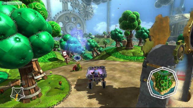 Une machine trop lourde à l'arrière et vous ne pouvez pas avancer, un véhicule trop long et pas assez renforcé en son centre et vous vous retrouvez avec deux moitiés pour le prix d'une. A vous d'essayer, de tester, de vous investir réellement dans la création. Une activité véritablement prenante qui, dans un registre bien plus restreint renvoie à l'expérience LittleBigPlanet, tout en restant plus centré sur le gameplay que sur un tout tentaculaire. L'inventivité dans Banjo-Kazooie : Nuts & Bolts est en effet au service d'un monde déjà existant et qui n'attend que vous pour être entièrement découvert. Une découverte facilitée d'une part par l'existence de modèles prédéfinis de véhicules (surtout si vous ne vous sentez pas l'âme créative, ce qui il faut l'avouer fait perdre le principal attrait du jeu) et d'autre part par la facilité d'accès du système de construction, ressemblant un tantinet à celui des vaisseaux Gummi de Kingdom Hearts II, en bien plus peaufiné toutefois. Les pièces récoltées peuvent s'assembler dans un nombre de combinaisons immense, se colorant de différentes façons selon la possibilité, ou non, de les fixer sur le châssis existant, rendant chaque action limpide. D'autant qu'il est possible d'effectuer une rotation de votre véhicule dans sa globalité. Une possibilité appliquée également à chacun des composants, permettant de ne subir que très rarement une frustration au moment de la conception. Le seul bémol restant l'obligation de vraiment avoir en tête ce que l'on souhaite construire. Les premières roues définissent en effet le sens de votre machine et il est malheureusement impossible de faire pivoter le siège du conducteur. Une petite tâche d'huile dans un garage bien rangé mais sur lequel notre duo peut facilement glisser.