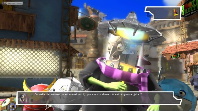 Sortis de leur obésité naissante par le retour raté de Grunty, Banjo et Kazooie, ainsi que leur ennemi de toujours, se rendent bien vite compte que leur temps est passé et qu'ils ne sont plus des personnages au sommet de leur gloire. C'est sans compter sur l'apparition messianique du maître des jeux vidéo (une sorte de poulpe surmonté d'un écran affichant continuellement Pong), qui leur propose de les remettre en selle avec un concept inédit basé sur la participation à des défis via l'utilisation de machines plus ou moins farfelues. Après un accord collégial, l'aventure commence à Duelville, sorte de ville-racine aux inspirations graphiques située entre Viva Piñata et Oddworld : Stranger. Tout ici n'est que décor, compilation de l'univers de Banjo-Kazooie. Que ce soit au sein des différents niveaux ou dans Duelville, chaque parcelle est montée de toutes pièces et chaque intervenant est issu d'une ou l'autre des aventures du duo. Un esprit qui se manifeste d'ailleurs de manière évidente lorsque l'on s'attarde sur la réalisation du jeu. Les décors sont fait de matériaux métalliques, de larges plaques de plastique, tentant de simuler les lieux habituels de la saga avec un aspect "artisanal" très bien senti. Certes, il existe des niveaux totalement nouveaux comme cet intérieur parodique de Xbox 360 aux vis saillantes, mais la majeure partie d'entre eux reste à base de déclinaisons aux choix artistiques convaincants. Le sentiment d'évoluer dans un monde créé littéralement de toutes pièces assez fascinant se développe alors, faisant directement écho au scénario dans une cohérence teintée d'auto-critique que l'on aimerait voir plus souvent. Car bien évidemment, l'humour acide de la série est d'actualité avec ses diverses réparties sèchement assénées ou ses nombreux clins d'œil amusants, comme les allusions aux échecs commerciaux de Rare ou les références à des séries télévisées bas-de-gamme via la présentation des divers niveaux. Il vous sera également conseillé d'acheter le Banjo-Kazooie original sur le Marketplace si vous n'aimez pas Banjo-Kazooie : Nuts & Bolts, habile petite pique résumant bien l'esprit général du soft. C'est sur ces bases presque habituelles que se greffe la nouveauté.