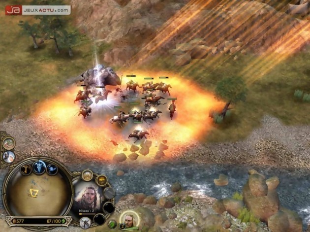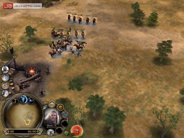 Du côté des forces du mal, les fermes sont remplacées par des scieries, et nécessitent donc d’avoir des paysans pour aller couper du bois. Car, comme vous le savez tous, les orques naissent dans des troncs d’arbres. J’ai beau avoir lu les trois bouquins et vu les trois films, je ne comprends toujours pas pourquoi les orques sont fabriqués grâce à la récolte du bois. Bref, une fois les ressources engrangées, vous pouvez construire des bâtiments militaires, dans lesquels seront produites vos unités de combat. Chacune des quatre formations (Rohan, Gondor, Isengard et Mordor) disposant de ses propres unités et de ses points forts. Les cavaliers du Rohan, les rôdeurs du Gondor, les Ourouk-haï de l’Isengard et les Trolls et les Mûmakils du Mordor. A cela viennent s’ajouter les héros cités plus haut. Chacun des héros grimpe de niveau au fil des combats et est doté de pouvoirs propres. Ainsi, au niveau 4, Gandalf pourra faire appel à Grispoil son cheval, ou invoquer des éclairs pour terrasser des groupes entiers d’ennemis. Aragorn, grâce à son charisme élevé, pourra motiver les troupes alliées et leur donner des bonus d’attaque. Gimli pourra faire tournoyer sa hache et faire trembler le sol, alors que Legolas pourra lancer des flèches puissantes et entraîner les unités d’archers pour leur faire gagner de l’expérience. Comme les héros, les bataillons peuvent également gagner de l’expérience allant de un à dix. Un bataillon de niveau dix étant beaucoup plus puissant et résistant qu’un bataillon venant de sortir de la caserne.